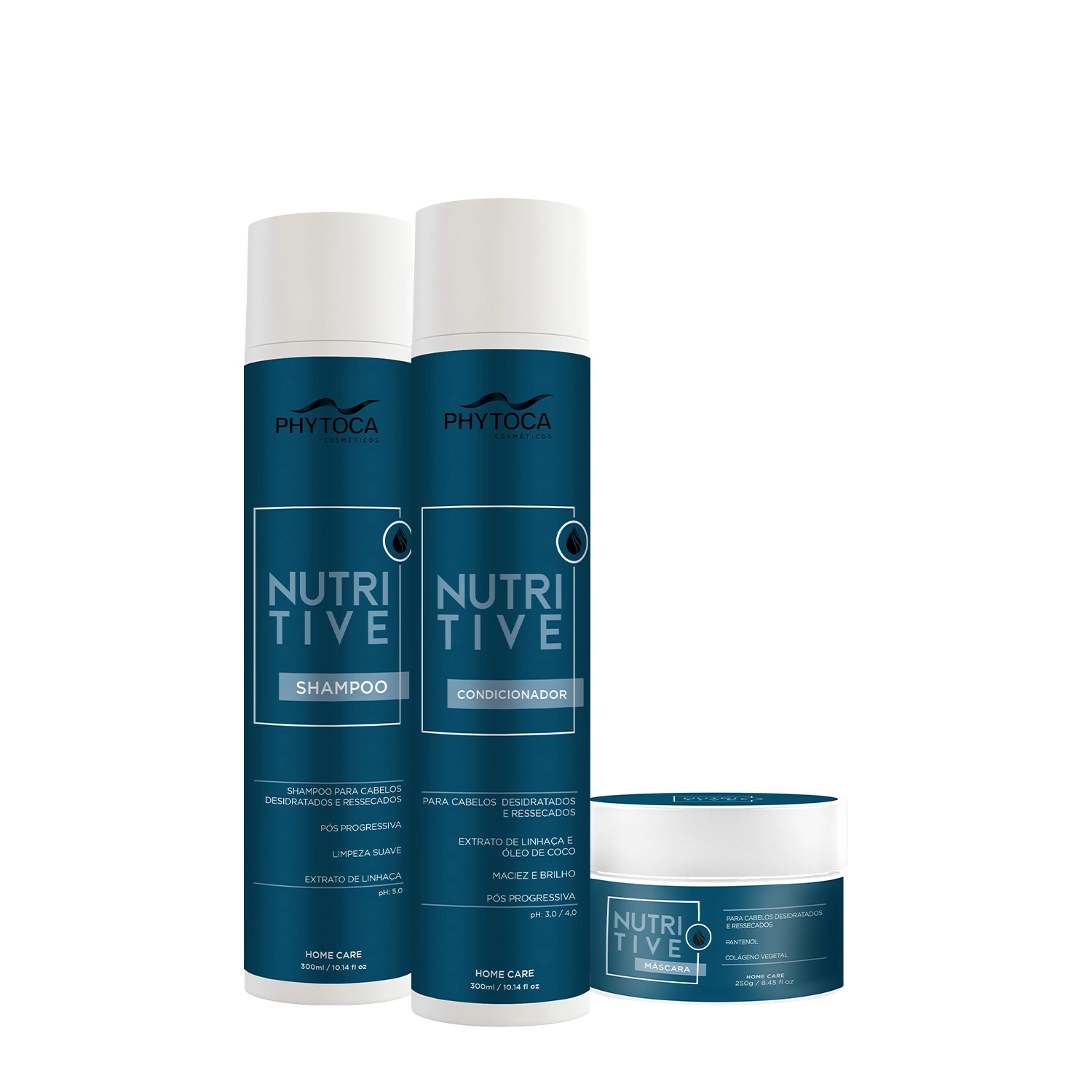 Kit Phytoca Cosmetics Nutritive Home Care (3 produtos) Este Kit Contém Phytoca Cosmetics Nutritive - Shampoo 300ml: promove uma limpeza suave e tratamento profundo para cabelos danificados. Enriquecido com óleo de coco, linhaça, creatina e pró-vitamina B5, restaura a hidratação e devolve nutrientes essenciais a fibra capilar. Restaura o brilho e a maciez dos fios fragilizados por química e calor. Phytoca Cosmetics Nutritive - Condicionador 300ml: realiza um tratamento profundo em cabelos secos e danificados. Enriquecido com óleo de coco, colágeno e linhaça, recupera a maciez, sela as cutículas e proporciona desembaraço fácil com muito brilho. Phytoca Cosmetics Nutritive - Máscara Capilar 250g: devolve a elasticidade, melhora o brilho e evita pontas duplas, deixando os cabelos mais macios, nutridos e com a cor protegida. Rico em colágeno vegetal, pantenol e pró-vitamina B5, repõe nutrientes essenciais e fortalece os fios. Conselho de Aplicação