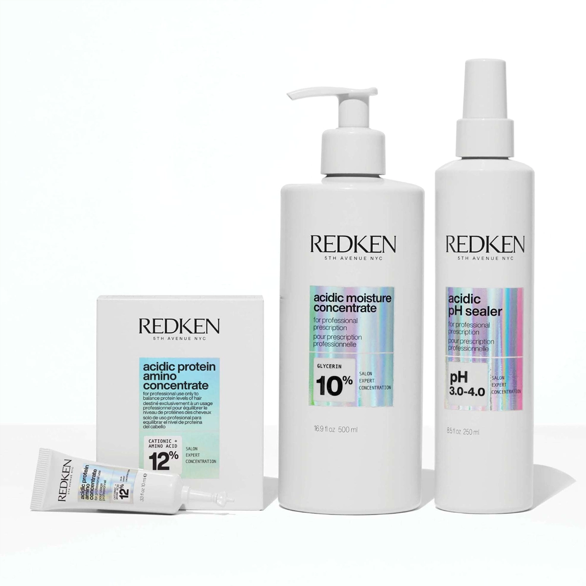 Sealer: use o pH Sealer em cooperação com o Redken Acidic Moisture Concentrate para direcionar o dano, com o Redken Acidic Protein Amino Concentrate para neutralizar a secura, ou ambos para um tratamento multiuso. Depois de aplicar essas duas fórmulas e enxaguar bem, pulverize de 10 a 15 bombeadas da raiz às pontas e deixe agir por um minuto. Termine enxaguando novamente e modelando o cabelo conforme desejado.