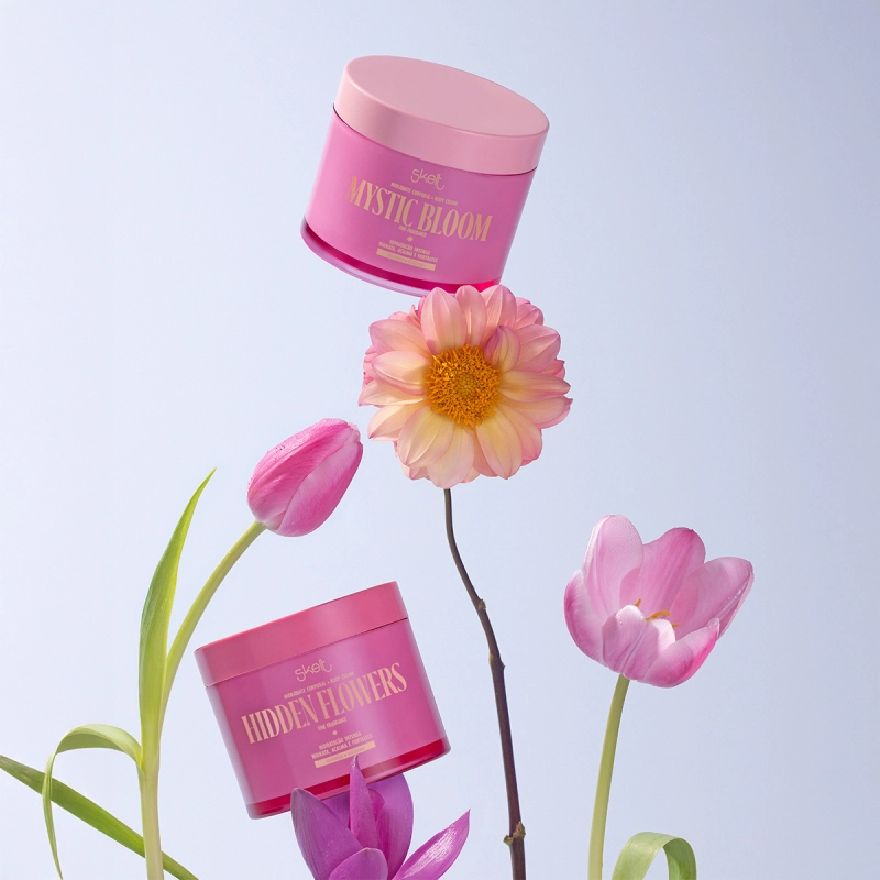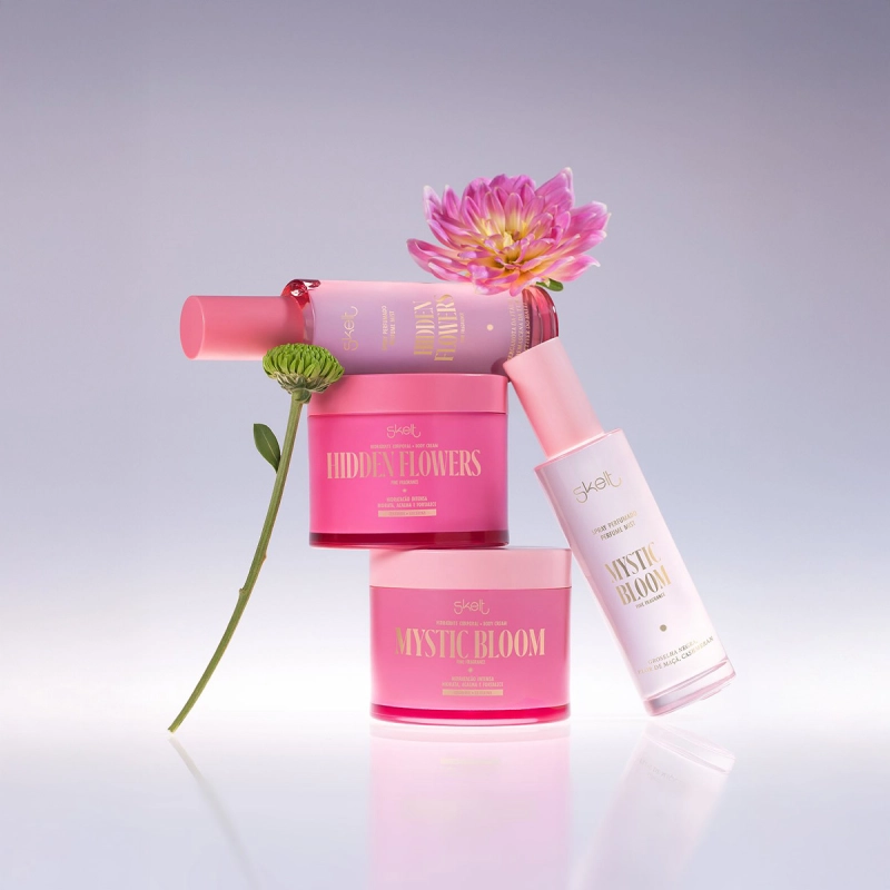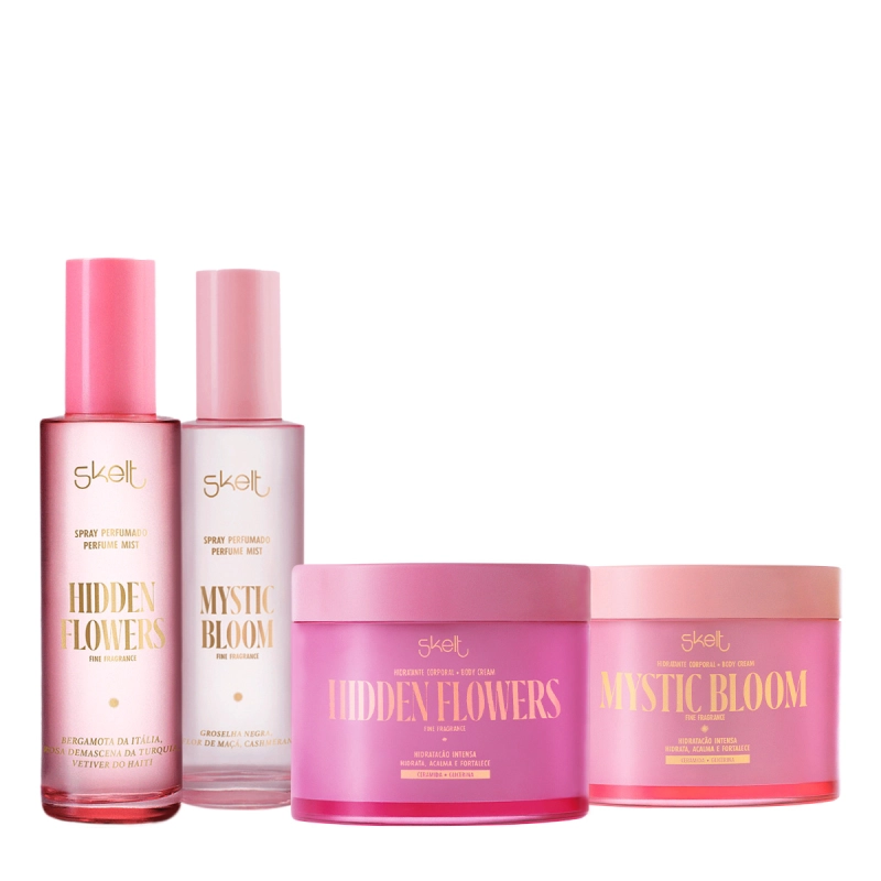 Este Kit Contém Skelt Mystic Bloom - Hidratante Corporal 200g: hidrata intensamente com ceramidas e glicerina, que fortalecem a barreira da pele. Sua textura cremosa de rápida absorção nutre, acalma e envolve com um perfume floral, frutado e cítrico adocicado que encanta todos os sentidos. Skelt Hidden Flowers - Hidratante Corporal 200g: fórmula nutritiva com ceramidas e glicerina para uma pele macia, protegida e radiante. Leve e de rápida absorção, garante hidratação profunda e uma fragrância floral frutada com nuances cítricas que trazem elegância e frescor. Skelt Hidden Flowers Perfume Mist - Body Splash 100ml: uma explosão vibrante de frutas e especiarias que evolui para um buquê floral sofisticado, finalizando com âmbar, musk e baunilha. Uma fragrância doce, envolvente e misteriosa como um jardim secreto. Skelt Mystic Bloom Perfume Mist - Body Splash 100ml: abre com groselha negra, morango e tangerina, segue com um coração floral sofisticado e finaliza com marshmallow, âmbar dourado, musk e cashmeran. Uma fragrância doce e inesquecível, perfeita para destacar sua essência com atitude. Conselho de Aplicação Skelt Secret Garden Collection - Nutrição, Leveza e Perfumes Envolventes para o Corpo