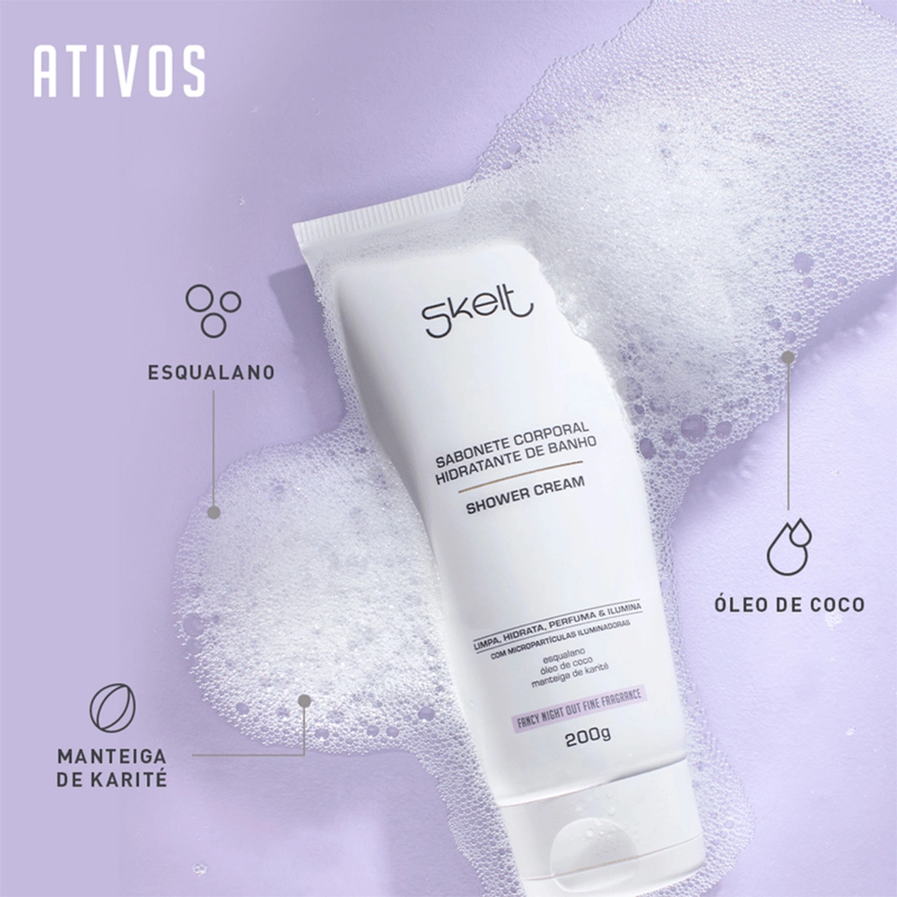 O Shower Cream Fancy Night Out é um sabonete líquido hidratante corporal para ser usado durante o banho que limpa enquanto hidrata, perfuma e ilumina. Conselho de Aplicação Durante o banho, espalhe o shower cream por todo o corpo com movimentos suaves - utilizando as mãos ou uma esponja. Enxágüe logo em seguida.Kit Skelt Shower Cream Fancy Night Out – Sabonete Líquido 200g (2 unidades)