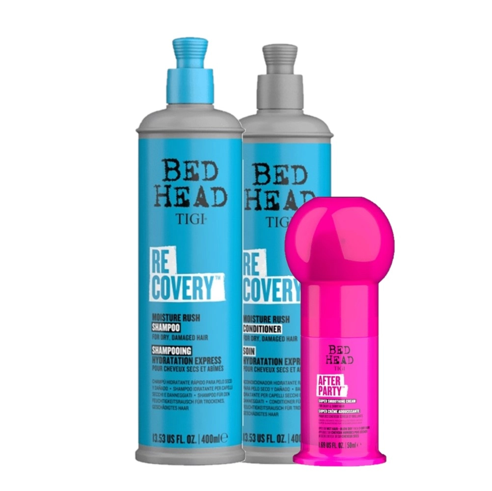 TIGI Bed Head Recovery Home Care Duo tamanho padrão para cabelos secos. retoma a saúde dos fios. Leave-in para todos os tipos de cabelo, After Party Smoothing Cream proporciona suavidade, maciez, brilho e controle do frizz. Kit Contém: TIGI Bed Head Recovery - Shampoo 400ml: limpa suavemente os fios, enquanto revitaliza, retomando o brilho e a maciez. TIGI Bed Head Recovery - Condicionador 400ml: possui intensa ação hidratante, que recupera totalmente a saúde dos fios, garantindo vitalidade. TIGI Bed Head - After Party 50ml: sua fórmula em creme deixa os fios mais sedosos, macios e com aparência saudável. Controla o arrepiado indesejado e reforça o brilho para um resultado incrível. COMO USAR Shampoo: Espalhe o produto nos cabelos molhados, da raiz às pontas, massageando suavemente o couro cabeludo. Enxágue e, se necessário, repita a operação. Condicionador: Aplique nos cabelos molhados, do comprimento às pontas, massageando suavemente. Deixe agir por alguns minutos e enxágue, retirando todo o produto. Kit TIGI Bed Head Recovery Home Care Smoothing Cream (3 produtos)