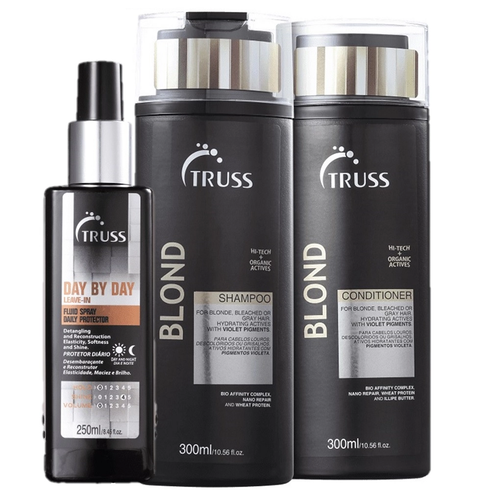 Blond de Truss é uma linha indicada para cabelos loiros, descoloridos ou grisalhos para recuperar a força e a resistência dos fios. Blond aumenta a flexibilidade natural dos cabelos, que ficam macios e brilhantes. Este Kit Contém Truss Blond - Shampoo 300ml: recupera a força e a resistência dos fios claros enquanto neutraliza o amarelado. Truss Blond Day By Day - Leave-in 250ml: protege os fios, facilita a escovação e reestrutura a fibra capilar. Como Usar Shampoo: Aplique o shampoo no cabelo molhado e massageie de forma suave até formar espuma. Enxágue e, caso necessário, lave os fios mais uma vez. Condicionador: Retire o excesso de água dos fios e distribua o condicionador no comprimento e pontas. Massageie, desembarace, deixe agir por 2 minutos e enxágue. Leave-in: Aplique uma pequena quantidade do finalizador na palma das mãos e distribua sobre comprimento e pontas dos cabelos úmidos. Depois, seque seus fios com o auxílio do secador e modele da forma que desejar.Kit Truss Blond Day Cabelos Loiros (3 Produtos)