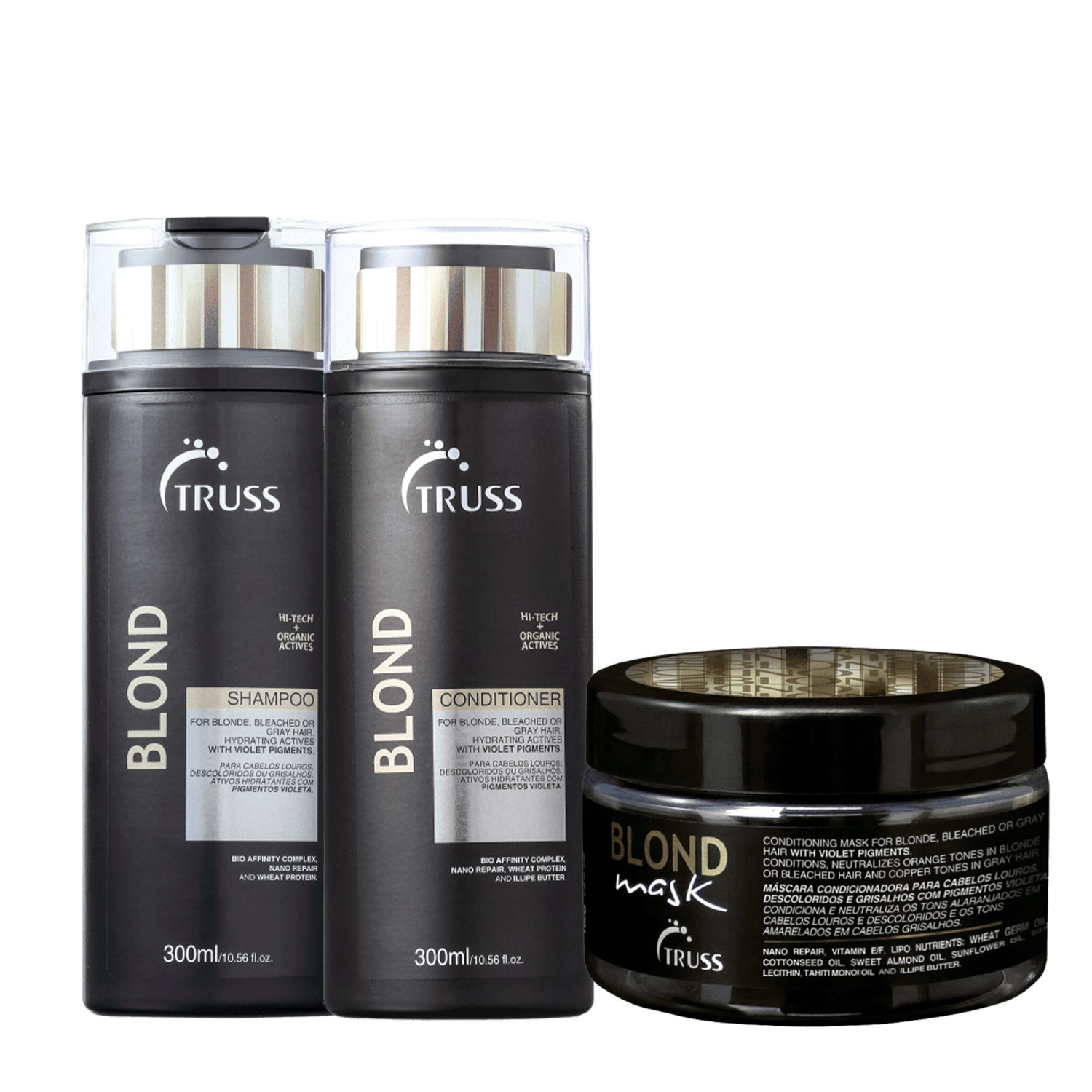 Kit Truss Blond Trio (3 Produtos) Esse Kit contém Truss Blond Shampoo 300ml: Shampoo desamarelador para cabelos loiros ou descoloridos. Truss Blond recupera a resistência dos fios e neutraliza o amarelado enquanto deixa o toque macio e a aparência mais brilhante. Truss Blond Condicionador 300ml: Condicionador para cabelos loiros, descoloridos ou grisalhos. Truss Blond Conditioner ajuda a neutralizar o tom amarelado e hidrata. Truss Blond Másk 180g: Máscara matizadora para cabelos loiros, descoloridos ou grisalhos. Truss Blond Mask condiciona e neutraliza tons alaranjados e amarelados. Aplique no cabelo úmido, massageando suavemente até a formação de espuma. Enxágue. Se necessário, repita a operação. Em seguida, utilize o Truss Specific Blond Hair Condicionador do comprimento às pontas, massageando suavemente. Enxágue. Uma vez por semana com os cabelos lavados e ainda úmidos aplique a Truss Specific Blond Hair Másk pelo comprimento e pontas e deixe agir por 3 minutos. Enxágue.
