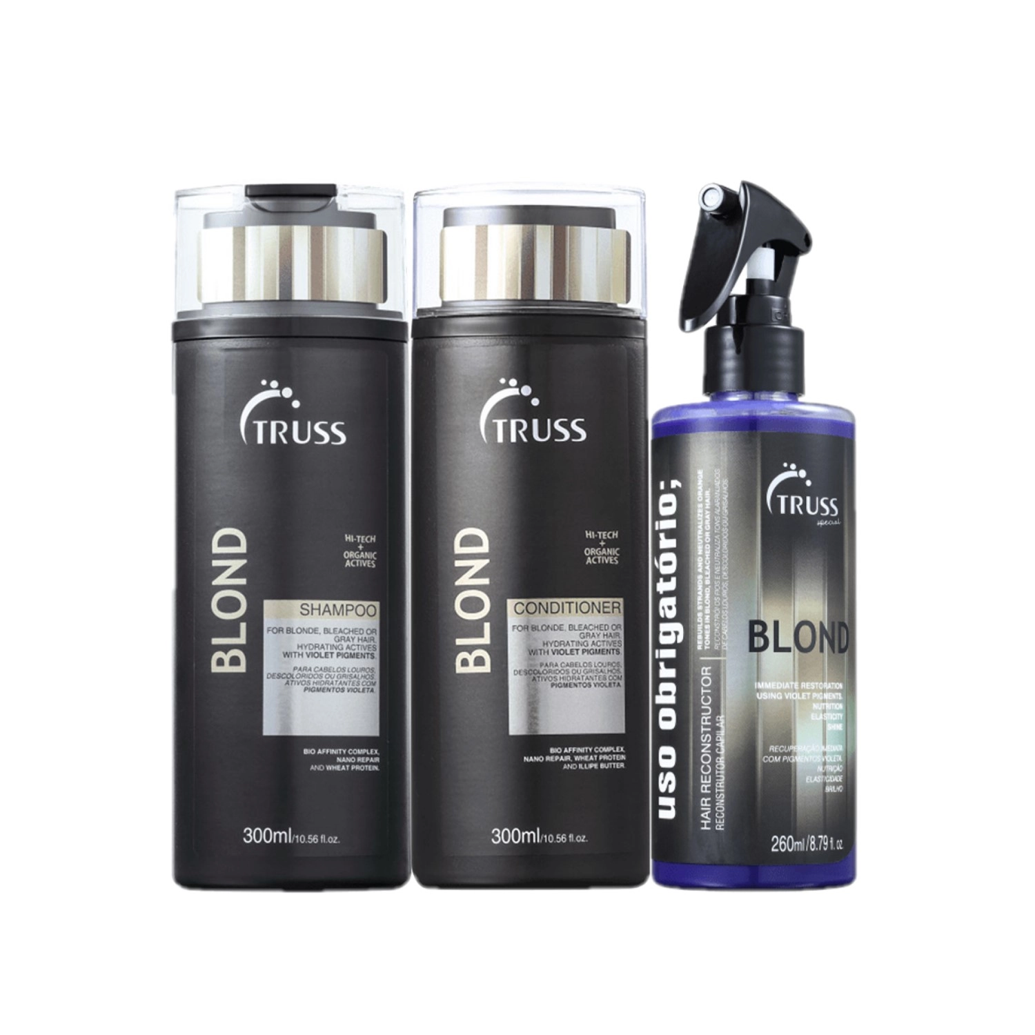 O Shampoo Truss Blond 300ml: é formulado com tecnologias que recuperam a elasticidade dos fios, protegendo contra as agressões externas. Truss Blond possui pigmentos violetas que resgatam o brilho platinado e eliminam o aspecto amarelado de forma progressiva. Truss Blond Conditioner 300ml: contém pigmentos violetas que eliminam o amarelamento da oxidação dos fios, causado pela exposição ao sol, uso de ferramentas de calor e demais agressões. Além disso, possui tecnologia que trata os fios de dentro para fora. Ela aumenta elasticidade e sela as cutículas, o que confere maior resistência contra a quebra, além de luminosidade constante e maciez que dura o dia inteiro. Truss - Uso Obrigatório Blond 260ml: tratamento reconstrutor e matizador para cabelos loiros, brancos descoloridos ou com luzes, restaura a integridade dos fios ao mesmo tempo que neutraliza os tons amarelados e alaranjados indesejados para promover um efeito platinado bonito. Shampoo: aplique o shampoo no cabelo molhado e massageie de forma suave até formar espuma. Enxágue e, caso necessário, lave os fios mais uma vez. Condicionador: após lavar o cabelo com o shampoo da linha, distribua o condicionador no comprimento e pontas e massageie. Desembarace os fios e deixe em pausa por 2 minutos. Enxágue em seguida. Uso Obrigatório Blond: Borrife o produto pelo comprimento e pontas do cabelo úmido e limpo. Use-o depois do shampoo e antes do condicionador. Deixe agir entre 30 segundos até 5 minutos, no máximo e enxágue. O Truss Uso Obrigatório Blond não deve ser usado como leave-in, sem enxágue. A matização pode variar de acordo com a estrutura do fio e o tempo de pausa, por isso a indicação no rótulo deve ser respeitada. Não use o tratamento no dia da descoloração ou das luzes, pois os fios podem absorver pigmentos demais. Na primeira aplicação, deixe agir entre 30 segundos e 1 minuto. Nas próximas vezes, aumente o tempo caso seja necessário, mas sempre respeitando o máximo de 5 minutos. Use quando for necessário restaurar os fios ou platinar.Kit Truss Blond Reparador de Cabelos Loiros (3 produtos)