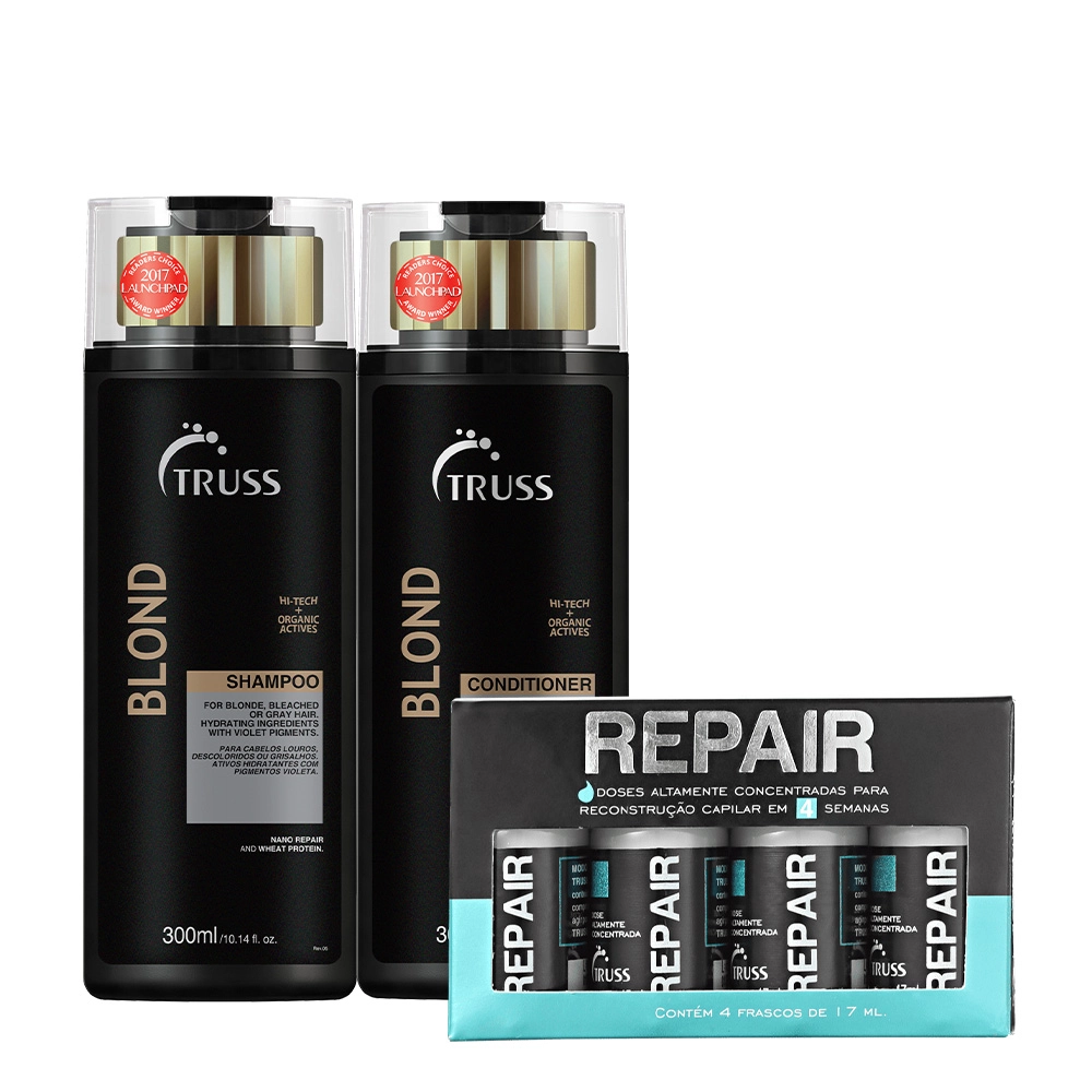 Este Kit Contém Truss Shock Repair - Ampolas de Reconstrução 17ml (4 unidades): para cabelos danificados. Regenera a fibra capilar para restaurar a resistência e a proteção contra os danos externos. Contém ativos concentrados que agem de dentro para fora do fio. Ela devolve a força, brilho, maciez e deixa mais fácil de pentear. Também previne a formação de pontas duplas e do frizz. Truss Blond - Shampoo 300ml: recupera a força e a resistência dos fios claros enquanto neutraliza o amarelado. Truss Blond Conditioner - Condicionador 300ml: oferece resistência e ajuda na neutralização do amarelado. Conselho de Aplicação Shampoo: aplique o shampoo no cabelo molhado e massageie de forma suave até formar espuma. Enxágue e, caso necessário, lave os fios mais uma vez. Kit Truss Blond Shampoo Condicionador Shock Repair (6 produtos)