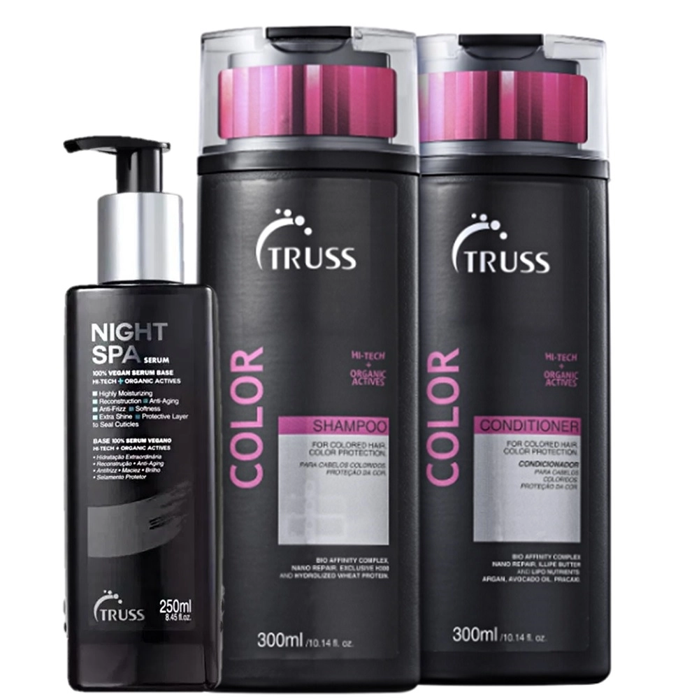 Com ativos emolientes e antioxidantes, Kit Truss Color Night repara a cutícula danificada e restaura os fios enquanto devolve a força e a maciez. Ele protege a coloração e aumenta a sua durabilidade. Conquiste fios brilhantes, sedosos e com cor vibrante. Truss Color Conditioner - Condicionador 300ml: desembaraça, promove brilho intenso e evita o desbotamento e alteração da cor. Truss Night Spa - Sérum de Tratamento Noturno 250ml: hidrata intensamente e protege das agressões externas, além de disciplinar e revitalizar os fios. Como Usar Conselho de Aplicação Aplique o shampoo sobre o cabelo úmido e massageie. Deixe agir por 2 minutos e enxágue. Repita a operação. Em seguida, passe o condicionador no comprimento e pontas. Massageie e deixe agir por 2 minutos. Enxágue. Aplique o sérum no comprimento e nas pontas (nunca na raiz) do cabelo seco à noite, mecha a mecha e massageie. Deixe agir durante o sono. No dia seguinte, lave de 2 a 3 vezes como de costume.Kit Truss Color Night Cabelos Coloridos (3 Produtos)