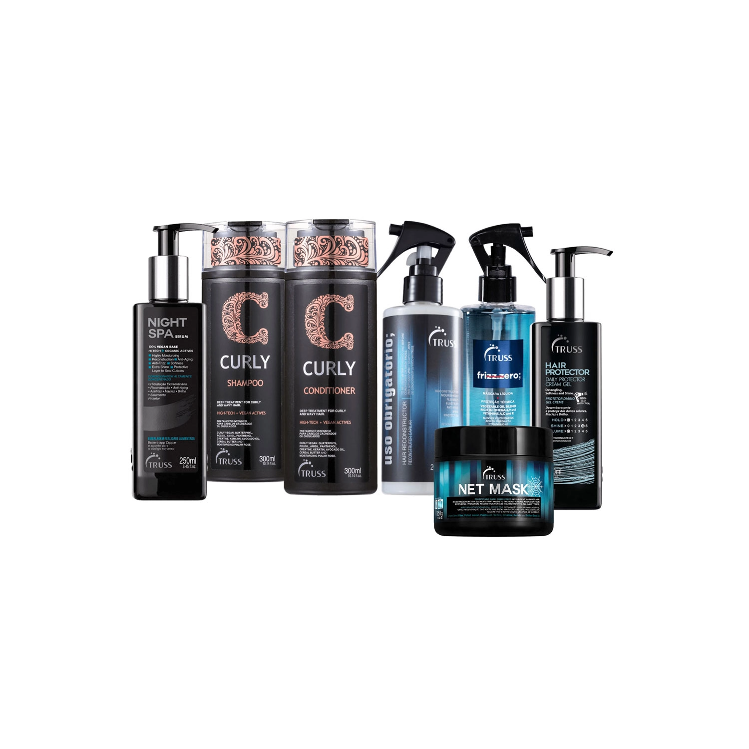 Kit Truss especial para cabelos cacheados e ondulados, que deixa o cabelo com definição, flexiveis e mais sedosos que recupera o aspecto saudável do cabelo quimicamente tratado. Seus ativos regeneram os fios danificados, que voltam a ter um aspecto saudável. Este kit contém: Condicionador Truss Curly 300ml: O Condicionador Curly Truss consegue combater o ressecamento para que o cabelo tenha uma aparência saudável. Sua fórmula ainda fixa o formato dos cachos e protege do frizz. Tudo isso sem pesar ou deixar oleoso. Tratamento Condicionante Truss Frizz Zero 260ml: é ultra-concentrado e de fácil absorção, foi desenvolvido para condicionar, hidratar, selar a cutícula capilar e devolver rapidamente a maciez, o brilho e a maleabilidade aos fios. Possui efeito instantâneo e ação anti-frizz, pode ser usado antes, durante ou depois dos seus cuidados com os cabelos. O Tratamento Reconstrutor Truss Uso Obrigatório 260ml: age com a reconstrução das partes do fio fragilizadas, a fim de restaurar a força e a resistência. A fórmula ainda conta com antioxidantes, que protegem dos danos causados por radicais livres ao mesmo tempo em que recupera os fios tingidos contra o desbotamento. Truss Uso Obrigatório recupera o aspecto saudável do cabelo quimicamente tratado, enquanto disciplina os fios, protege do calor do secador e evita a formação de pontas duplas. Truss Net Mask 550g: capilar para cabelos danificados. Truss Net Mask repõe massa e devolve a elasticidade e força aos fios. Ela sela as cutículas, prolonga a hidratação e intensifica o brilho do cabelo. Seus ativos regeneram os fios danificados, que voltam a ter um aspecto saudável. Quando usada no cabelo afro, oferece disciplina e definição. Seus fios ficam disciplinados, sedosos e brilhantes. Truss Hair Protector 250ml: Leave-in indicado para todos os tipos de cabelos. Truss Protector desembaraça e protege dos raios UV, calor do secador e dos danos mecânicos causados pela escova. Sérum de Tratamento Noturno Truss Night Spa 250ml: proporciona uma blindagem que mantém os nutrientes dentro da fibra capilar. Previne a ação dos agentes externos, que reduzem o frizz e aumenta o brilho. Regenera a fibra capilar danificada e disciplina fios arrepiados. Conselho de aplicação Shampoo: aplique o shampoo no cabelo molhado e massageie de forma suave até formar espuma. Enxágue e, caso necessário, lave os fios mais uma vez. Condicionador: após lavar o cabelo com o shampoo da linha, distribua o condicionador no comprimento e pontas e massageie. Desembarace os fios e deixe em pausa por 2 minutos. Enxágue em seguida. Uso Obrigatório: ele pode ser aplicado como tratamento ou leave-in. Para o primeiro resultado, após lavar o cabelo com shampoo, aplique o reconstrutor e, sem enxaguar, siga para o uso do condicionador. Para o segundo, aplique sobre o cabelo limpo e úmido. Finalize como desejar. Tratamento Condicionante: Cabelos finos: após lavar o cabelo com shampoo, aplique a máscara no comprimento e pontas. Massageie, deixe agir de 5 a 10 minutos e enxágue. Não é necessário o uso de condicionador. Máscara: Espalhe uma pequena quantidade da máscara na palma das duas mãos. Em seguida, aperte uma palma contra a outra para ativar o efeito "teia", que imita uma teia de aranha e ajuda a distribuição da máscara. Feito isso, aplique a máscara em todo o comprimento e pontas do cabelo úmido e aguarde de 5 a 10 minutos. Enxágue completamente. Protetor Térmico: aplique uma pequena quantidade do leave-in na palma das mãos e distribua sobre comprimento e pontas dos cabelos úmidos. Depois, seque seus fios com o auxílio do secador e modele como desejar. Tratamento Noturno: aplique o sérum no comprimento e nas pontas (nunca na raiz) do cabelo seco à noite, mecha a mecha e massageie. Deixe agir durante o sono. No dia seguinte, lave de 2 a 3 vezes como de costume.Kit Truss Curly Tratamento de Definição (7 produtos)
