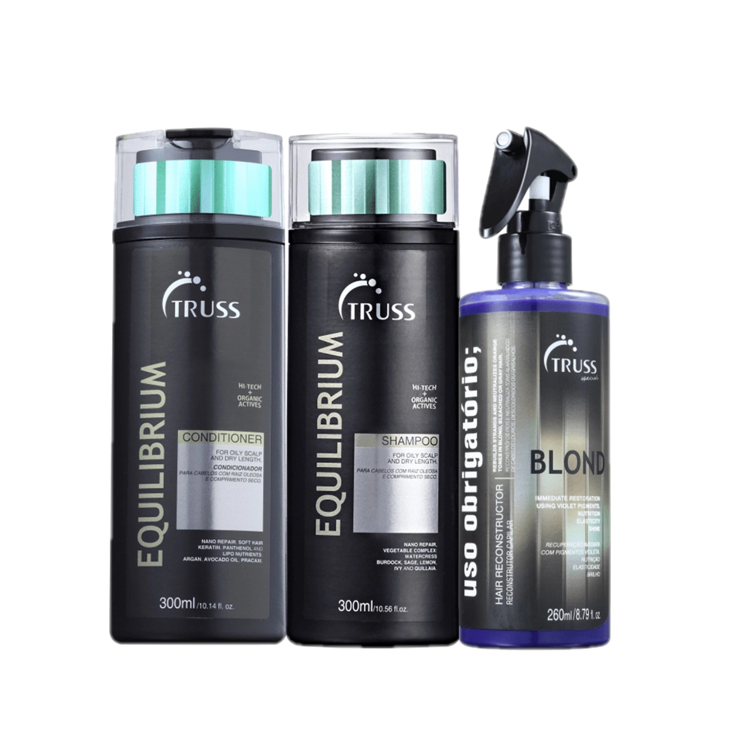 Este kit contém: Truss Equilibrium Shampoo - 300ml: limpa o couro cabeludo enquanto regula a oleosidade da raiz. Truss Equilibrium Condicionador - 300ml: desembaraça sem pensar os fios enquanto previne o excesso de oleosidade. Truss - Uso Obrigatório Blond 260ml: tratamento reconstrutor e matizador para cabelos loiros, brancos descoloridos ou com luzes, restaura a integridade dos fios ao mesmo tempo que neutraliza os tons amarelados e alaranjados indesejados para promover um efeito platinado bonito. Shampoo: aplique shampoo no cabelo molhado e massageie o couro cabeludo e os fios. Enxágue e repita a operação. Condicionador: passe o condicionador no comprimento e pontas do cabelo limpo e úmido. Deixe agir por 2 minutos e enxágue completamente. Uso Obrigatório Blond: Borrife o produto pelo comprimento e pontas do cabelo úmido e limpo. Use-o depois do shampoo e antes do condicionador. Deixe agir entre 30 segundos até 5 minutos, no máximo e enxágue. O Truss Uso Obrigatório Blond não deve ser usado como leave-in, sem enxágue. A matização pode variar de acordo com a estrutura do fio e o tempo de pausa, por isso a indicação no rótulo deve ser respeitada. Não use o tratamento no dia da descoloração ou das luzes, pois os fios podem absorver pigmentos demais. Na primeira aplicação, deixe agir entre 30 segundos e 1 minuto. Nas próximas vezes, aumente o tempo caso seja necessário, mas sempre respeitando o máximo de 5 minutos. Use quando for necessário restaurar os fios ou platinar.Kit Truss Equilibrium Blond (3 produtos)