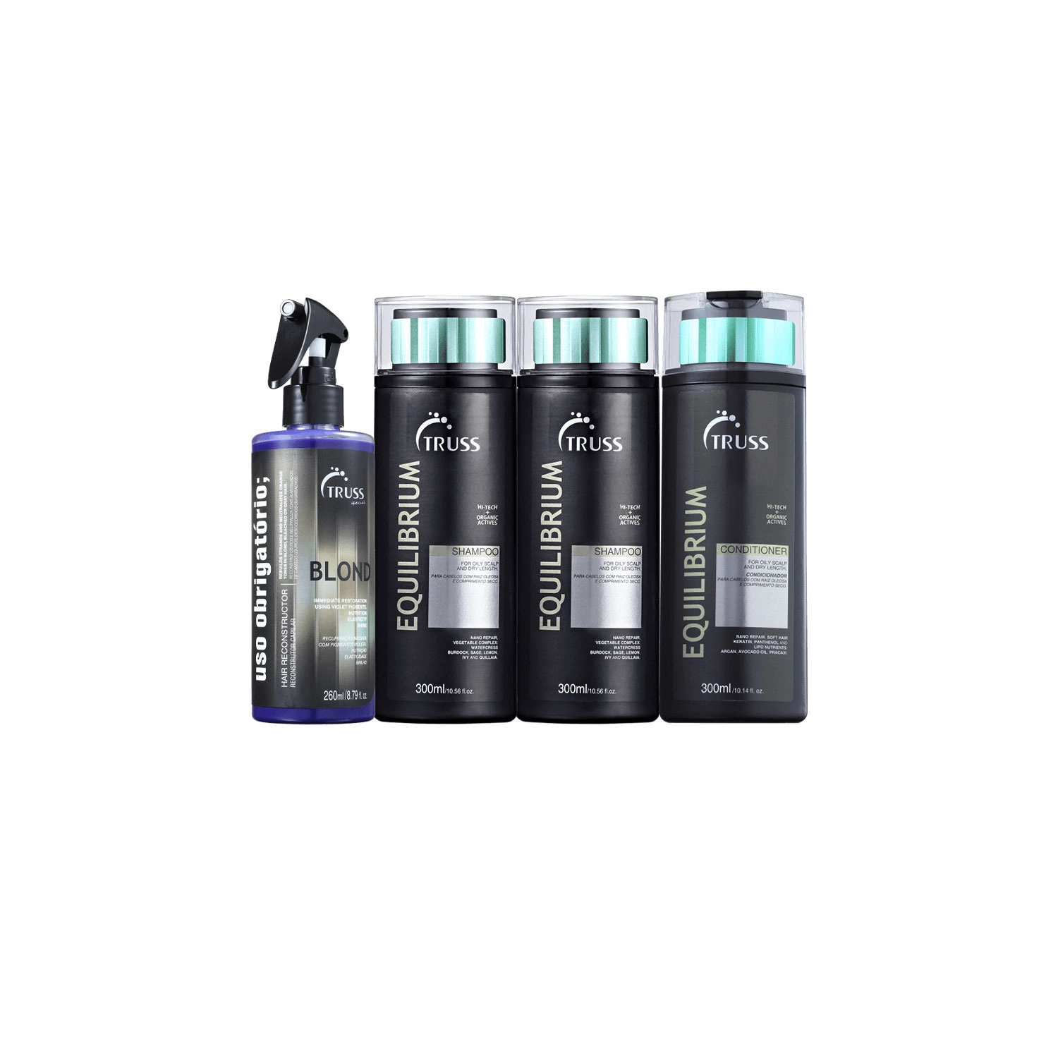 Este kit contém: Truss Equilibrium Shampoo - 300ml (2 unidades): limpa o couro cabeludo enquanto regula a oleosidade da raiz. Truss Equilibrium Condicionador - 300ml: desembaraça sem pensar os fios enquanto previne o excesso de oleosidade. Truss - Uso Obrigatório Blond 260ml: tratamento reconstrutor e matizador para cabelos loiros, brancos descoloridos ou com luzes, restaura a integridade dos fios ao mesmo tempo que neutraliza os tons amarelados e alaranjados indesejados para promover um efeito platinado bonito. Shampoo: aplique shampoo no cabelo molhado e massageie o couro cabeludo e os fios. Enxágue e repita a operação. Condicionador: passe o condicionador no comprimento e pontas do cabelo limpo e úmido. Deixe agir por 2 minutos e enxágue completamente. Uso Obrigatório Blond: Borrife o produto pelo comprimento e pontas do cabelo úmido e limpo. Use-o depois do shampoo e antes do condicionador. Deixe agir entre 30 segundos até 5 minutos, no máximo e enxágue. O Truss Uso Obrigatório Blond não deve ser usado como leave-in, sem enxágue. A matização pode variar de acordo com a estrutura do fio e o tempo de pausa, por isso a indicação no rótulo deve ser respeitada. Não use o tratamento no dia da descoloração ou das luzes, pois os fios podem absorver pigmentos demais. Na primeira aplicação, deixe agir entre 30 segundos e 1 minuto. Nas próximas vezes, aumente o tempo caso seja necessário, mas sempre respeitando o máximo de 5 minutos. Use quando for necessário restaurar os fios ou platinar.Kit Truss Equilibrium Blond Contra Oleosidade (4 produtos)
