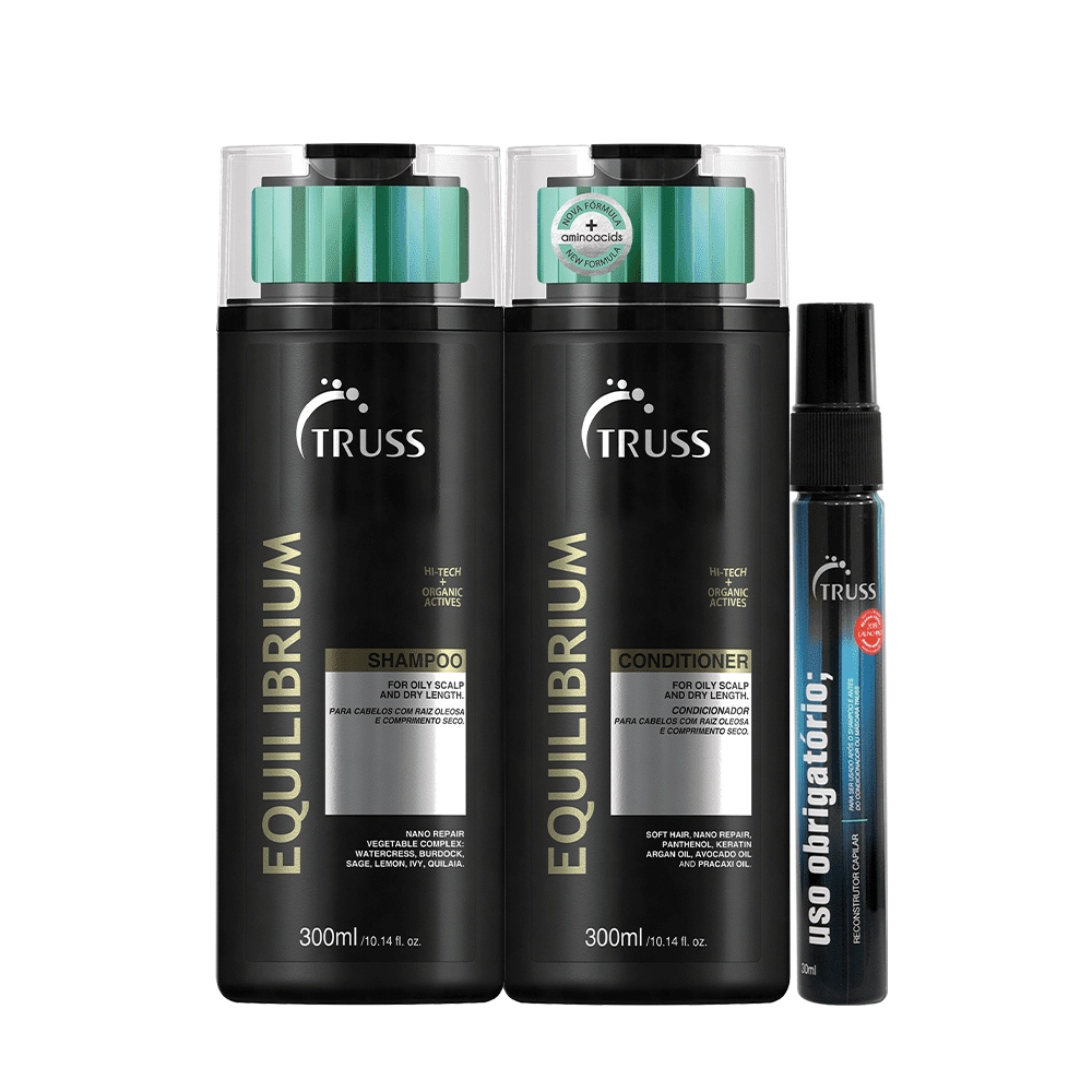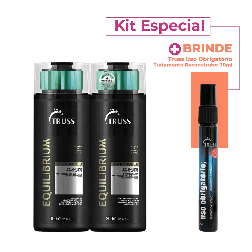 Esse Kit Contém Ganhe Truss Mini Uso Obrigatório Tratamento Reconstrutor 30ml: Reconstrutor para cabelos danificados. Truss Uso Obrigatório recupera o aspecto saudável enquanto disciplina e protege do calor. Conselho de AplicaçãoKit Truss Equilibrium Duo (3 produtos)