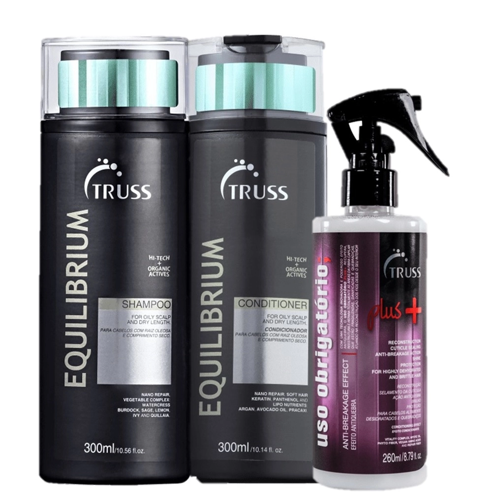 A linha Truss Equilibrium é a solução para quem tem raiz oleosa e pontas secas, afinal, dá um trabalho manter o couro cabeludo limpo sem deixar o resto do cabelo ressecado. Suas fórmulas ajudam a regular a oleosidade da raiz enquanto hidratam a extensão e pontas dos fios para manter a aparência saudável dos cabelos, com leveza e toque sedoso. Este Kit Contém Truss Equilibrium Shampoo - 300ml: limpa o couro cabeludo enquanto regula a oleosidade da raiz. Truss Blond Uso Obrigatório - Reconstrutor Capilar 260ml: conta com uma inovadora tecnologia antiquebra, recupera, reestrutura e repara totalmente as áreas da fibra capilar que estão fragilizadas. Como Usar Conselho de Aplicação Shampoo: Aplique o shampoo no cabelo molhado e massageie de forma suave até formar espuma. Enxágue e, caso necessário, lave os fios mais uma vez. Condicionador: Retire o excesso de água dos fios e distribua o condicionador no comprimento e pontas. Massageie, desembarace, deixe agir por 2 minutos e enxágue. Uso Obrigatório: Após o uso do shampoo e antes do condicionador ou máscara, borrife o Reconstrutor no comprimento e pontas dos cabelos e deixe agir de 5 a 10 minutos. Massageie e enxágue.Kit Truss Equilibrium Plus Cabelos Oleosos (3 Produtos)
