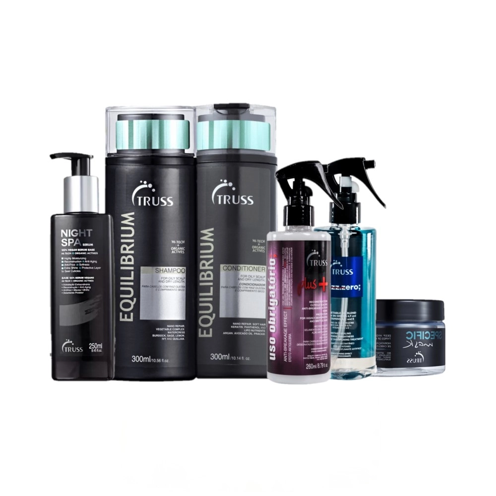 Este Kit Contém Truss Equilibrium - Shampoo 300ml: indicado para cabelos mistos a oleosos atua no couro cabeludo para regular o excesso de oleosidade da raiz. Truss Equilibrium - Condicionador 300ml: indicado para cabelos mistos a oleosos ajuda a prevenir o excesso de oleosidade e hidrata para manter do cabelo saudável. Truss Uso Obrigatório Plus+ - Reconstrutor Capilar Antiquebra 260ml: conta com uma inovadora tecnologia antiquebra, recupera, reestrutura e repara totalmente as áreas da fibra capilar que estão fragilizadas. Os ativos agem diretamente nos danos dos fios e devolvem nutrição, vitalidade, brilho e elasticidade. Truss Frizz Zero – Máscara Líquida Proteção Térmica 260ml: foi desenvolvido para condicionar, hidratar, selar a cutícula capilar e devolver rapidamente a maciez, o brilho e a maleabilidade aos fios. Truss Specific Mask - Máscara Capilar 180g: repara os fios de forma intensa enquanto repõe a hidratação. Truss Night Spa - Sérum de Tratamento Noturno 250ml: promove hidratação profunda que revitaliza os fios, além de proporcionar uma blindagem que mantém os nutrientes dentro da fibra capilar. Previne a ação dos agentes externos, que reduzem o frizz e aumenta o brilho. Regenera a fibra capilar danificada e disciplina fios arrepiados. Conselho de Aplicação Shampoo: aplique o shampoo nos cabelos úmidos massageando suavemente. Depois enxague abundantemente. Se preferir uma limpeza mais profunda repita todo o processo. Condicionador: com os cabelos lavados e ainda úmidos aplique o condicionador pelo comprimento dos fios. Deixe agir por alguns minutos e depois enxague abundantemente. Reconstrutor: após o uso do shampoo e antes do condicionador ou máscara, borrife o reconstrutor no comprimento e pontas dos cabelos e deixe agir de 5 a 10 minutos. Massageie e enxague. Máscara capilar: após lavar o cabelo, aplique a máscara no comprimento e pontas dos fios. Massageie as mechas e deixe agir por 5 minutos. Enxague bem. Use de 1 a 3 vezes por semana. Máscara Líquida: utilizar antes de lavar os fios, como pré-shampoo, ou durante a lavagem, como máscara líquida. Em cabelos grossos, utilizar depois de lavar os fios, como leave-in, facilitador da escova e protetor térmico. Sérum: aplique o sérum no comprimento e nas pontas (nunca na raiz) do cabelo seco à noite, mecha a mecha e massageie. Deixe agir durante o sono. No dia seguinte, lave de 2 a 3 vezes como de costume. Kit Truss Equilibrium Plus Frizz Specific Night Spa (6 produtos)