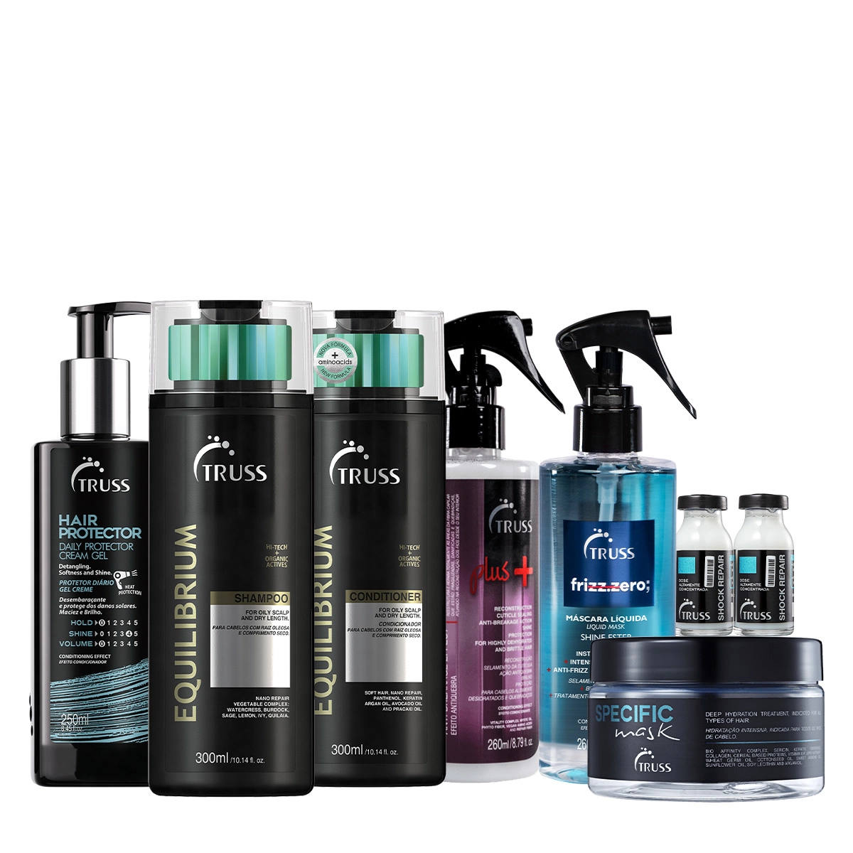 Esse kit contém Truss Equilibrium - Shampoo 300ml: limpa o couro cabeludo enquanto regula a oleosidade da raiz. Truss Equilibrium - Condicionador 300ml: desembaraça sem pensar os fios enquanto previne o excesso de oleosidade. Truss Shock Repair - Ampolas de Reconstrução 17ml (2 unidades): para cabelos danificados. Regenera a fibra capilar para restaurar a resistência e a proteção contra os danos externos. Contém ativos concentrados que agem de dentro para fora do fio. Ela devolve a força, brilho, maciez e deixa mais fácil de pentear. Também previne a formação de pontas duplas e do arrepiado. Truss Uso Obrigatório Plus 260ml: recupera, reestrutura e repara totalmente as áreas da fibra capilar fragilizadas. Truss Frizz Zero - Tratamento Disciplinante Antifrizz 260ml: desembaraça instantaneamente o cabelo danificado e proteje contra os danos calsados por ferramentas térmicas como secador e chapinha. Pode ser usado após o shampoo para uma ação condicionante e também ser utilizado como finalizador. Truss Hair Protector leave-in 250ml: Leave-in indicado para todos os tipos de cabelos. Truss Finish Hair Protector desembaraça e protege dos raios UV, calor do secador e dos danos mecânicos causados pela escova. Truss Specific - Máscara Capilar 180g: repara os fios de forma intensa enquanto repõe a hidratação. Conselho de Aplicação Kit Truss Equilibrium Shampoo Condicionador Uso obrigatório Plus Frizz Zero Hair Protector Specific Mask e Shock Repair (8 produtos)
