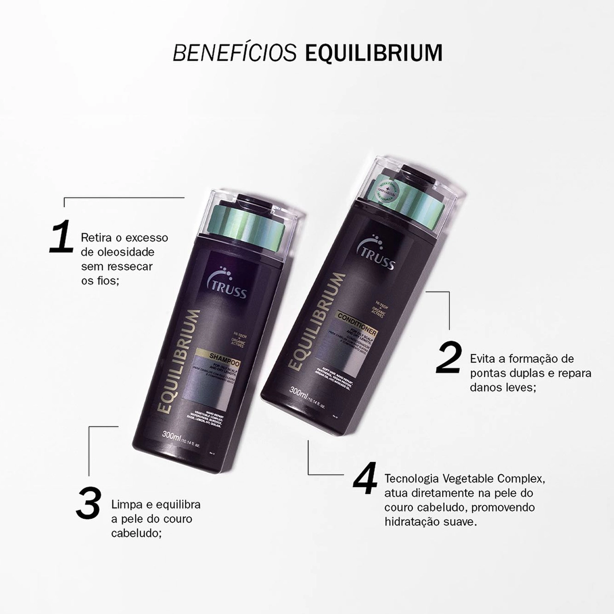 Kit Truss Equilibrium Specific Uso Obrigatório Home Care Óleo (4 produtos) Este Kit Contém Truss Equilibrium - Shampoo 300ml: limpa o couro cabeludo enquanto regula a oleosidade da raiz. Truss Equilibrium - Condicionador 300ml: desembaraça sem pensar os fios enquanto previne o excesso de oleosidade. Truss Specific - Máscara 180g: para todos os tipos de cabelo. Repara os fios intensamente, enquanto repõe a hidratação. Tratamento elaborado com vitaminas, proteínas e óleos que reestruturam a fibra capilar com o resgate da força e a elasticidade do córtex. Ele confere disciplina e emoliência aos fios para que eles fiquem maleáveis, com brilho e macios novamente. Truss Uso Obrigatório - Óleo Capilar 60ml: revitaliza cabelos danificados, agindo interna e externamente nos fios. Oferece blindagem completa contra danos térmicos, químicos e ambientais, além de proporcionar maciez, flexibilidade e controle do frizz. Sua textura leve garante rápida absorção e um acabamento impecável, sem pesar nos fios. Reúne o poder de um condicionador líquido, leave-in e tratamento profundo em uma única fórmula.