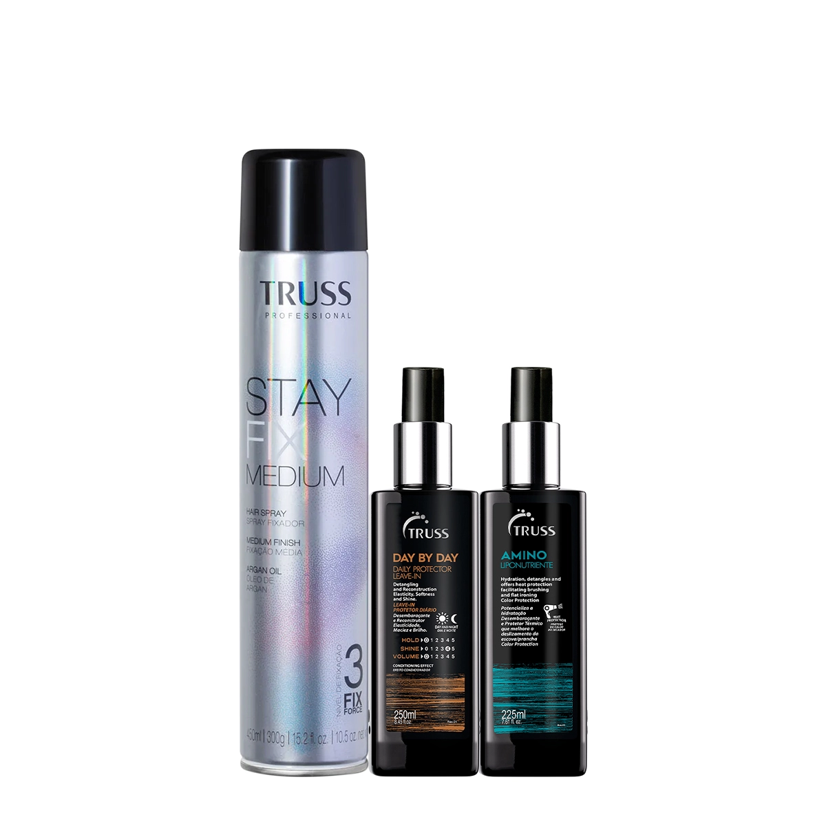 Esse Kit Contém Truss Stay Fix Medium - Spray Fixador 450ml: fixação média para o penteado sem pesar, ressecar ou enrijecer. Com efeito barreira sem fios arrepiados para uma finalização com aspecto de récem feita. Possui fórmula enriquecida com óleo de Argan. Truss Day By Day- Fluid Spray 250ml: para cabelos danificados e ressecados protege os fios, facilita a escovação e reestrutura a fibra capilar.Truss Day By Day desembaraça, nutre e ajuda na reconstrução das áreas fragilizadas. Ele recupera a elasticidade, o brilho e a maciez no seu cuidado diário com o fio, seja de dia ou à noite. É ideal para cabelos que não tem tendência a oleosidade. Truss Amino Lipotropic Nutrients 225ml: potencializa sua hidratação! Protetor térmico hidratante em spray com efeito desembaraçante para uso junto a escova/prancha. Desembaraçante e Protetor Térmico que melhora o deslizamento da escova/prancha. Proteção e Tratamento: Promove selamento dos fios e reduz o tempo de secagem. Proporciona brilho intenso de gloss. Color Protection. Conselho de aplicação Kit Truss Fix Medium Day By Day e Amino Lipotropic (3 produtos)