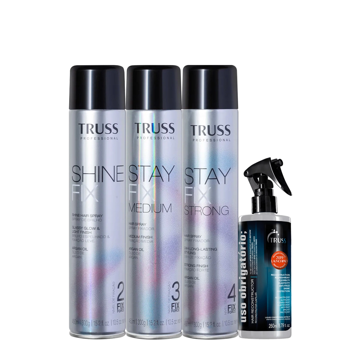 Este Kit Contém Truss Shine Fix - Spray de Brilho 450ml: spray de jato seco que fixa e doa brilho ao penteado sem pesar, ressecar ou enrijecer. Com efeito barreira sem fios arrepiados para uma finalização com aspecto de recém feita. Possui fórmula enriquecida com óleo de argan e fixação de nível leve para um penteado mais radiante! Truss Stay Fix Medium - Spray Fixador 450ml: fixação média para o penteado sem pesar, ressecar ou enrijecer. Com efeito barreira sem fios arrepiados para uma finalização com aspecto de récem feita. Possui fórmula enriquecida com óleo de Argan. Truss Stay Fix Strong - Spray Fixador Forte 450ml: fixação forte para o penteado sem pesar, ressecar ou enrijecer. Com efeito barreira sem fios arrepiados para uma finalização com aspecto de récem feita. Possui fórmula enriquecida com óleo de Argan. Truss Uso Obrigatório - Tratamento Reconstrutor 260ml: recupera o aspecto saudável do cabelo danificado e quimicamente tratado. Ele também disciplina os fios, protege do calor do secador e evita a formação de pontas duplas. age com a reconstrução das partes do fio que estão danificadas e fragilizadas para restaurar a força e a resistência. A fórmula ainda conta com antioxidantes que protegem dos danos causados por radicais livres. Outra característica importante é a proteção que oferece aos fios tingidos contra o desbotamento. Com esse reconstrutor, seu cabelo volta a ser lindo e saudável rapidamente. Conselho de AplicaçãoKit Truss Fix Medium Strong Shine e Uso Obrigatório (4 produtos)