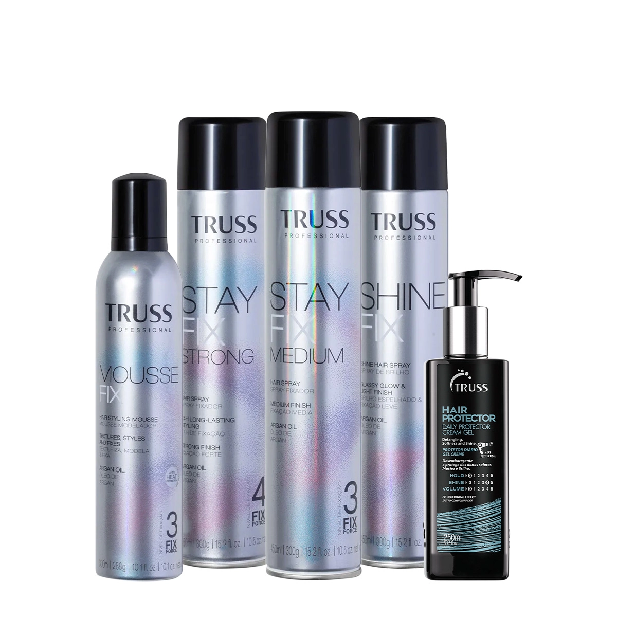 Kit Truss Fix Mousse Modelador Strong Medium Shine Fix Spray de Brilho e Hair Protector (5 produtos)
