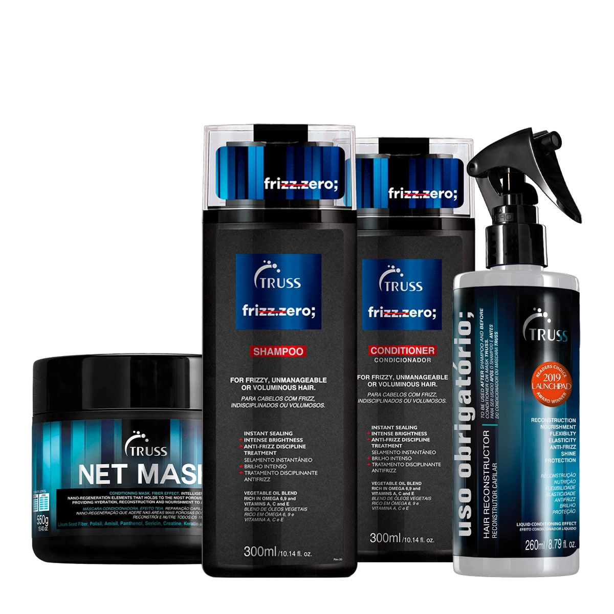 Compostos por exclusiva fórmula contendo shine ester, ativo vegetal 100% biodegradável que interage com as proteínas da fibra capilar, formando um filme molecular uniforme e proporcionando brilho intenso, além de realçar a cor em cabelos naturais, descoloridos e tingidos. Contem blend de óleos vegetais rico em ômega 6 E 9 E em vitaminas a, C e e, que são depositados de forma eficaz sobre a fibra, os produtos promovem limpeza suave, condicionamento notável desde a primeira aplicação, e ação antifrizz e antiumidade, proporcionando um toque aveludado sem pesar nos fios. Este Kit Contém Truss Frizz Zero - Shampoo 300ml: Limpa suavemente, proporcionando selamento instantâneo e brilho intenso. Truss Frizz Zero - Condicionador 300ml: Desembaraça instantaneamente o cabelo danificado, além de reduzior o frizz e promover brilho intenso. Truss Net Mask - Mascara Capilar 550g: para cabelos danificados, repõe massa e devolve a elasticidade e força aos fios. Truss Uso Obrigatorio - Tratamento Reconstrutor 260ml: para cabelos danificados, recupera o aspecto saudável enquanto disciplina e protege do calor. Como Usar Conselho de Aplicação Aplique o shampoo, massageie suavemente, deixe agir por 2 minutos e enxágue. Repita Espalhe uma pequena quantidade da máscara na palma das duas mãos. Em seguida, aperte uma palma contra a outra para ativar o efeito "teia", que imita uma teia de aranha e ajuda a distribuição da máscara. Feito isso, aplique a máscara em todo o comprimento e pontas do cabelo úmido e aguarde de 5 a 10 minutos. Enxágue completamente. Após, aplique o condicionador, massageie, deixe agir por 2 minutos. Uso Obrigatorio pode ser aplicado como tratamento ou leave-in. Para o primeiro resultado, após lavar o cabelo com shampoo, aplique o reconstrutor e, sem enxaguar, siga para o uso do condicionador. Para o segundo, aplique sobre o cabelo limpo e úmido. Finalize como desejar.Kit Truss Frizz Zero Mask Obrigatorio (4 Produtos)