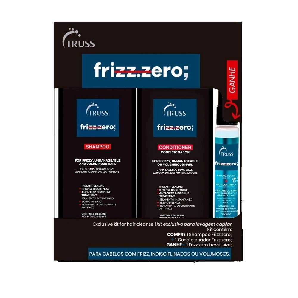 Compostos por exclusiva fórmula contendo shine ester, ativo vegetal 100% biodegradável que interage com as proteínas da fibra capilar, formando um filme molecular uniforme e proporcionando brilho intenso, além de realçar a cor em cabelos naturais, descoloridos e tingidos; e blend de óleos vegetais rico em ômega 6 E 9 E em vitaminas a, C e e, que são depositados de forma eficaz sobre a fibra, os produtos promovem limpeza suave, condicionamento notável desde a primeira aplicação, e ação antifrizz e antiumidade, proporcionando um toque aveludado sem pesar nos fios. Este Kit Contém Truss Frizz Zero - Shampoo 300ml: Limpa suavemente, proporcionando selamento instantâneo e brilho intenso. Truss Frizz Zero - Condicionador 300ml: Desembaraça instantaneamente o cabelo danificado, além de reduzior o frizz e promover brilho intenso. Truss Frizz Zero Travel Size - Leave-in 30ml: Tratamento disciplinante antifrizz, desembaraça instantaneamente o cabelo danificado. Como Usar Conselho de Aplicação Shampoo: Aplique, massageie suavemente, deixe agir por 2 minutos e enxágue. Repita Condicionador: Após o shampoo, aplique, massageie, deixe agir por 2 minutos. O Leave-in pode ser usado de 3 formas: 1- Pré Shampoo: Borrife no cabelo seco antes da aplicação do shampoo. Deixe agir por 5 minutos e lave normalmente. 2- Máscara Liquida: Borrife após o shampoo, massageie e enluve os fios. Deixe agir de 5 a 10 minutos. Enxágue. 3 - Protetor Térmico: Para ser usado como facilitador da escova , aplique no cabelo limpo e úmido antes de utilizar fontes de calor, como secador ou prancha.Kit Truss Frizz Zero Travel (3 Produtos)