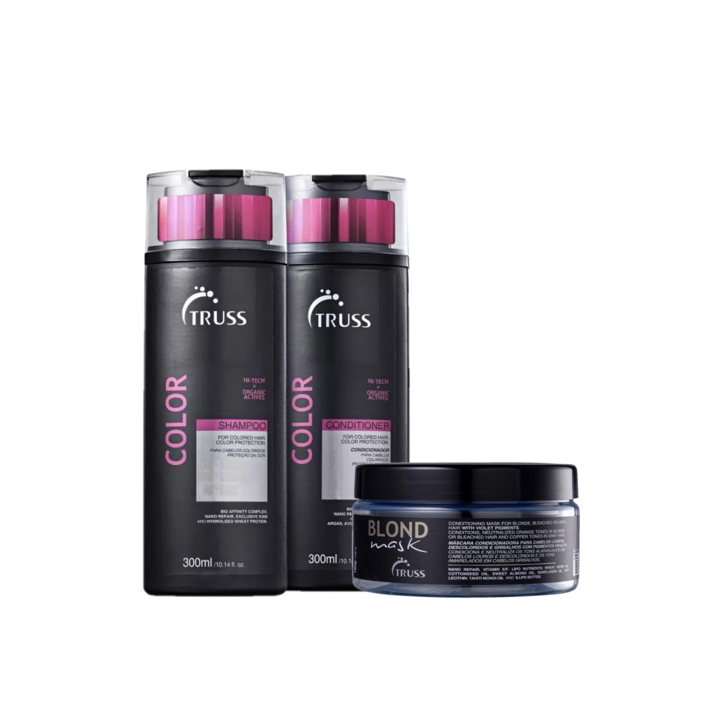 Truss Color - Shampoo 300ml: limpa, prolonga o brilho e previne o desbotamento e alteração da cor. Truss Color Conditioner - Condicionador 300ml: desembaraça, promove brilho intenso e evita o desbotamento e alteração da cor. Truss Blond Mask - Máscara Capilar 180g: traz uma poderosa combinação de ativos para recuperar a força, resistência e flexibilidade natural dos fios, deixando-os macios, brilhantes e com a cor radiante. Shampoo: aplique o shampoo sobre o cabelo úmido e massageie. Deixe agir por 2 minutos e enxágue. Repita a operação. Condicionador: em seguida, passe o condicionador no comprimento e pontas. Massageie e deixe agir por 2 minutos. Enxágue. Máscara: aplique a máscara após o shampoo, deixe agir por 5 minutos e enxágue bem. Indicada para uso de 1 a 3 vezes por semana.Kit Truss Home Care Color Blond (3 Produtos)
