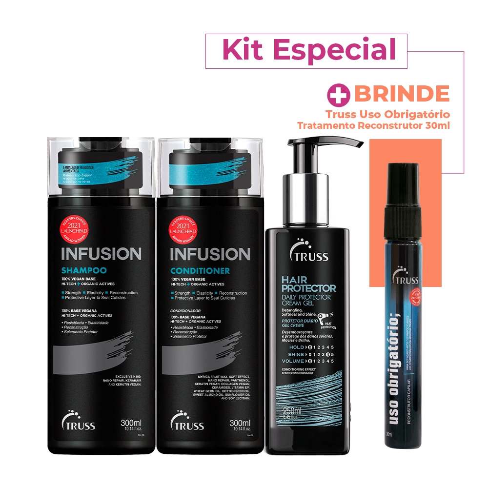 Este Kit Contém Truss Infusion - Shampoo 300ml: limpa, auxilia na reparação e fortalecimento dos fios para restaurar sua resistência, flexibilidade e saúde. Truss Infusion - Condicionador 300ml: reconstrói, hidrata, fortalece e desembaraça os fios. Truss Hair Protector - Leave-in 250ml: auxilia na recuperação da estrutura natural dos fios. Com ele, você sente seu cabelo com brilho intenso e leveza incrível. Ganhe Truss Mini Uso Obrigatório Tratamento Reconstrutor 30ml: Reconstrutor para cabelos danificados. Truss Uso Obrigatório recupera o aspecto saudável enquanto disciplina e protege do calor Conselho de AplicaçãoKit Truss Infusion Protecao (4 produtos)