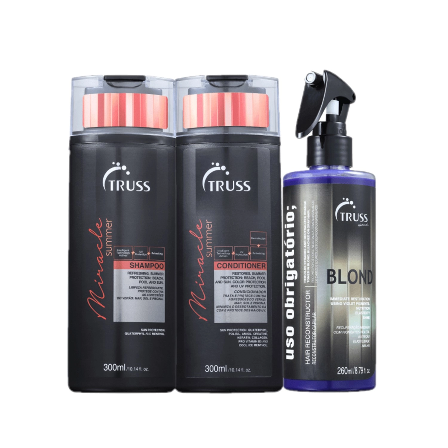Truss Miracle Summer - Shampoo 300ml: shampoo para cabelos expostos ao sol, ao mar, ao cloro da piscina e ao vento. Truss Miracle Summer Shampoo protege e hidrata para manter os fios a salvo dos danos causados pelos raios UV, do sal e do cloro da água. Truss Miracle Summer - Condicionador 300ml: condicionador para cabelos expostos ao sol, mar, cloro da piscina ou vento. Truss Miracle Summer Conditioner hidrata e protege os fios das agressões intensificadas pelo verão. Truss - Uso Obrigatório Blond 260ml: tratamento reconstrutor e matizador para cabelos loiros, brancos descoloridos ou com luzes, restaura a integridade dos fios ao mesmo tempo que neutraliza os tons amarelados e alaranjados indesejados para promover um efeito platinado bonito. Shampoo: aplique o shampoo sobre o cabelo úmido. Massageie gentilmente e deixe agir por 2 minutos. Em seguida, enxágue. Condicionador: aplique o condicionador sobre o cabelo limpo e úmido. Espalhe apenas pelo comprimento e pontas, evitando a raiz. Deixe agir por 2 minutos e, então, enxágue. Uso Obrigatório Blond: borrife o produto pelo comprimento e pontas do cabelo úmido e limpo. Use-o depois do shampoo e antes do condicionador. Deixe agir entre 30 segundos até 5 minutos, no máximo e enxágue. O Truss Uso Obrigatório Blond não deve ser usado como leave-in, sem enxágue. A matização pode variar de acordo com a estrutura do fio e o tempo de pausa, por isso a indicação no rótulo deve ser respeitada. Não use o tratamento no dia da descoloração ou das luzes, pois os fios podem absorver pigmentos demais. Na primeira aplicação, deixe agir entre 30 segundos e 1 minuto. Nas próximas vezes, aumente o tempo caso seja necessário, mas sempre respeitando o máximo de 5 minutos. Use quando for necessário restaurar os fios ou platinar.Kit Truss Miracle Summer Blond (3 produtos)