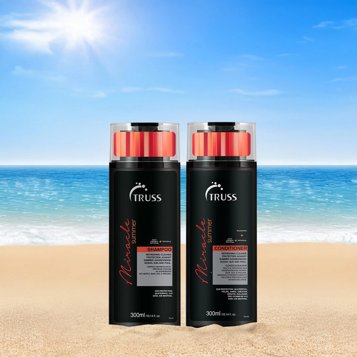 Shampoo para cabelos expostos ao sol, ao mar, ao cloro da piscina e ao vento. Miracle Summer Shampoo protege e hidrata para manter os fios a salvo dos danos causados pelos raios UV, do sal e do cloro da água. Condicionador para cabelos expostos ao sol, mar, cloro da piscina ou vento. Miracle Summer Conditioner hidrata e protege os fios das agressões intensificadas pelo verão. Máscara de tratamento para cabelos danificados. Miracle ajuda a recuperar profundamente o brilho e a maciez dos fios enquanto reduz o frizz no dia a dia. Uso Obrigatório recupera o aspecto saudável enquanto disciplina e protege do calor, age com a reconstrução das partes do fio fragilizadas, a fim de restaurar a força e a resistência. A fórmula ainda conta com antioxidantes, que protegem dos danos causados por radicais livres ao mesmo tempo em que recupera os fios tingidos contra o desbotamento. Kit Contém: Truss Miracle Summer - Shampoo 300ml: proporciona uma sensação refrescante deliciosa. Tem ação anti-frizz e proporciona maciez e brilho intenso. Além disso, protege a coloração do desbotamento. Aproveite o verão com cabelos incríveis e saudáveis! Truss Miracle Summer - Condicionador 300ml: aumenta a resistência do cabelo contra os danos causados pelos raios UV, mar e piscina enquanto melhora o pentear, recupera a vitalidade e reduz o frizz. Assim, seus fios ficam prontos para aproveitar o verão com brilho, maciez e proteção. Truss Miracle - Máscara de Tratamento 180g: proporciona hidratação e nutrição ao cabelo indisciplinado e com danos. Seu uso garante um crescimento saudável e um aspecto incrível logo na primeira aplicação. Truss - Uso Obrigatório 260ml: recupera o aspecto saudável do cabelo quimicamente tratado, enquanto disciplina os fios, protege do calor do secador e evita a formação de pontas duplas. Shampoo:Aplique o shampoo sobre o cabelo úmido. Massageie gentilmente e deixe agir por 2 minutos. Em seguida, enxágue. Condicionador: Aplique o condicionador sobre o cabelo limpo e úmido. Espalhe apenas pelo comprimento e pontas, evitando a raiz. Deixe agir por 2 minutos e, então, enxágue. Máscara: Após a limpeza com o shampoo, aplique a máscara no cabelo ainda úmido e massageie para total penetração. Faça um tempo de pausa de 5 a 10 minutos e enxágue cuidadosamente, até remover todo o produto. Uso obrigatorio: Ele pode ser aplicado como tratamento ou leave-in.Kit Truss Miracle Summer Mask Uso Obrigatório (4 produtos)