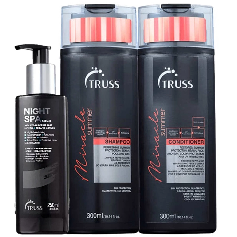 O Kit Truss Miracle Summer Night ajuda a manter os cabelos protegidos das agressões causadas pelo mar, o sol e o cloro da piscina. Deixa os fios hidratados, macios e com a cor protegida, evitando o desbotamento. Este Kit Contém Truss Miracle Summer - Condicionador 300ml: Condicionador para cabelos expostos ao sol, mar, cloro da piscina ou vento. Truss Miracle Summer Conditioner hidrata e protege os fios das agressões intensificadas pelo verão. Truss Miracle Summer - Shampoo 300ml: Shampoo para cabelos expostos ao sol, ao mar, ao cloro da piscina e ao vento. Truss Miracle Summer Shampoo protege e hidrata para manter os fios a salvo dos danos causados pelos raios UV, do sal e do cloro da água. Truss Night Spa - Sérum de Tratamento Noturno 250ml: hidrata intensamente e protege das agressões externas, além de disciplinar e revitalizar os fios. Como Usar Conselho de Aplicação Aplique o shampoo sobre o cabelo úmido. Massageie gentilmente e deixe agir por 2 minutos. Em seguida, enxágue. Aplique o condicionador sobre o cabelo limpo e úmido. Espalhe apenas pelo comprimento e pontas, evitando a raiz. Deixe agir por 2 minutos e, então, enxágue. Aplique o sérum no comprimento e nas pontas (nunca na raiz) do cabelo seco à noite, mecha a mecha e massageie. Deixe agir durante o sono. No dia seguinte, lave de 2 a 3 vezes como de costume.Kit Truss Miracle Summer Night Cabelos Secos (3 Produtos)