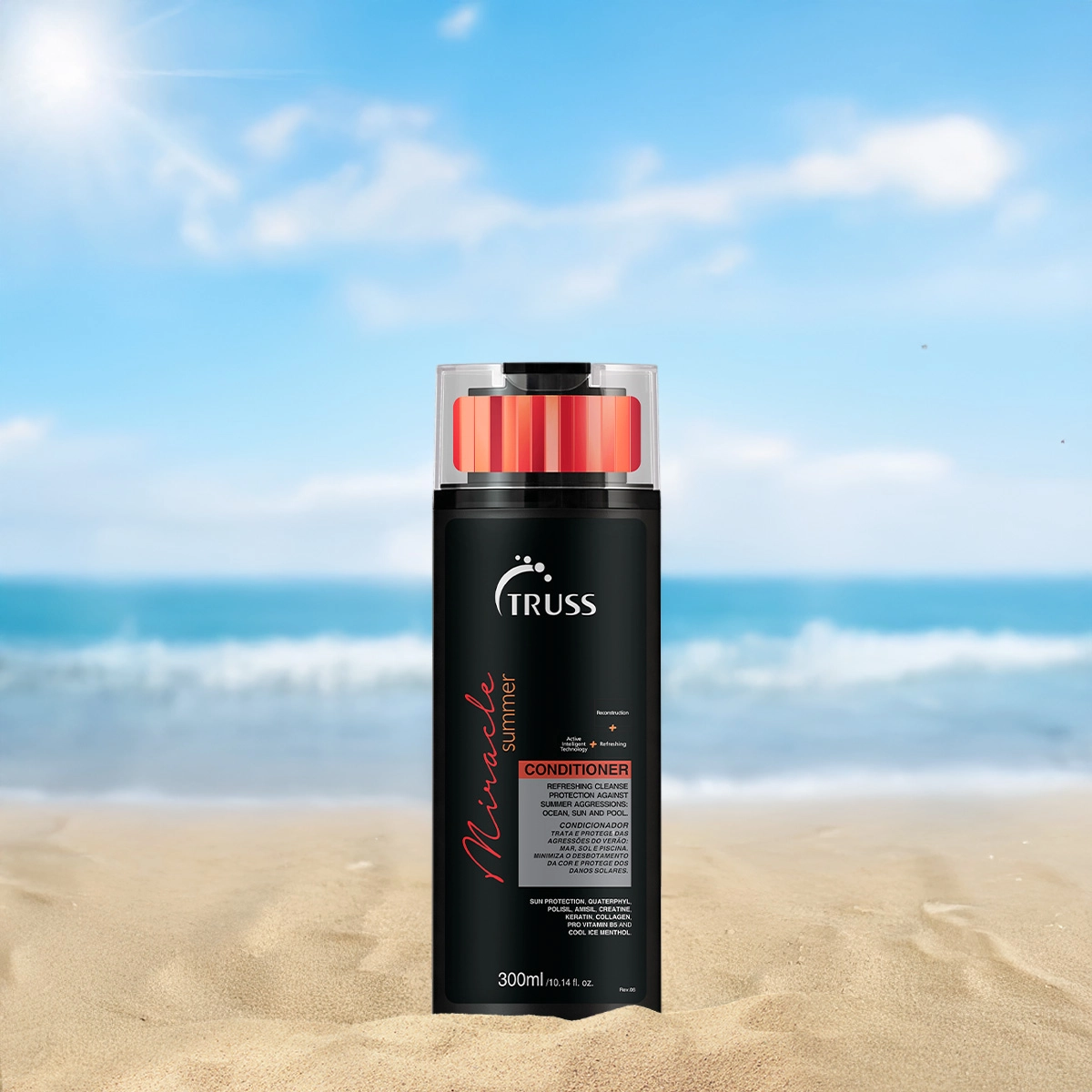 Truss Miracle Summer - Condicionador 300ml: para cabelos expostos ao sol, mar, cloro da piscina ou vento. Truss Miracle Summer Conditioner hidrata e protege os fios das agressões intensificadas pelo verão.