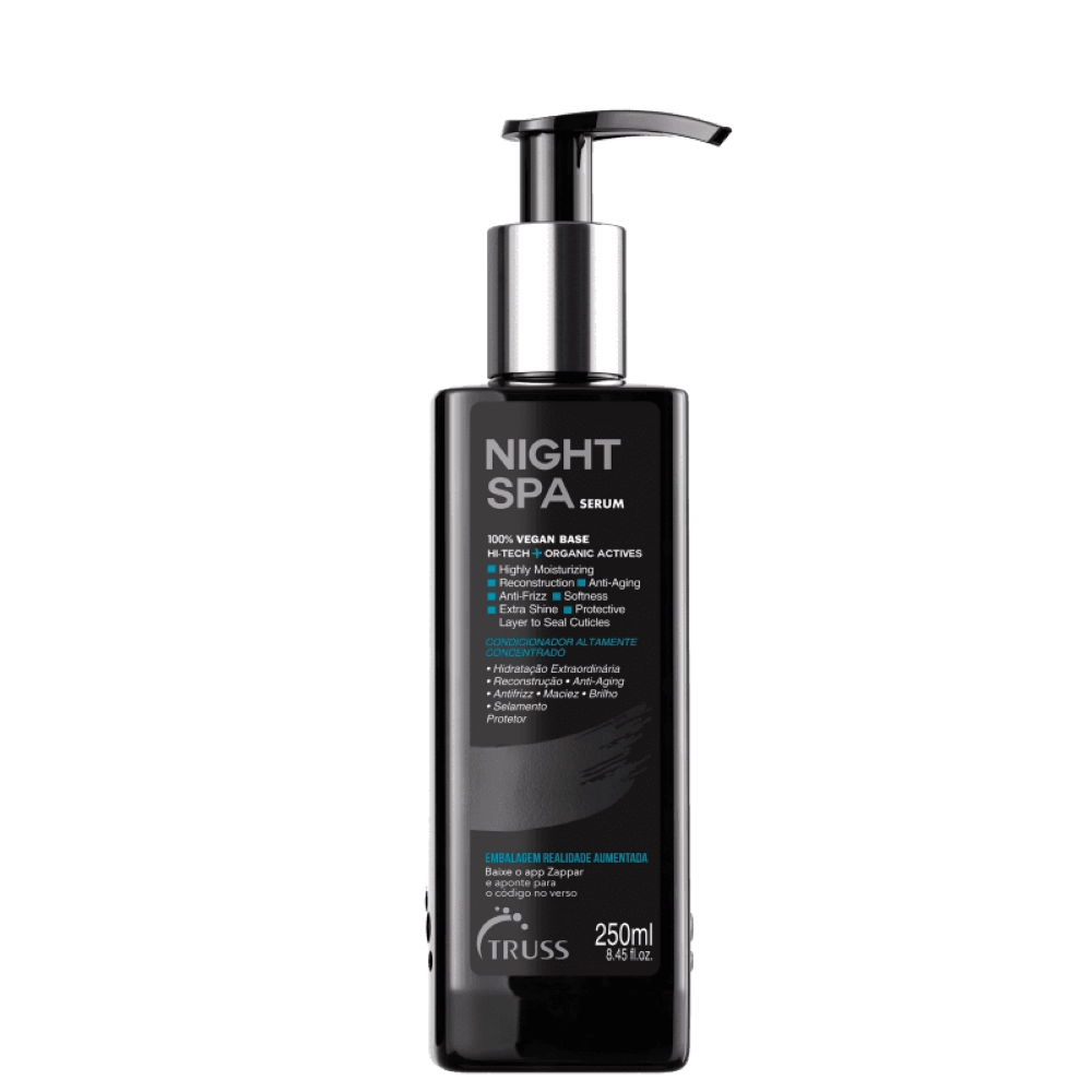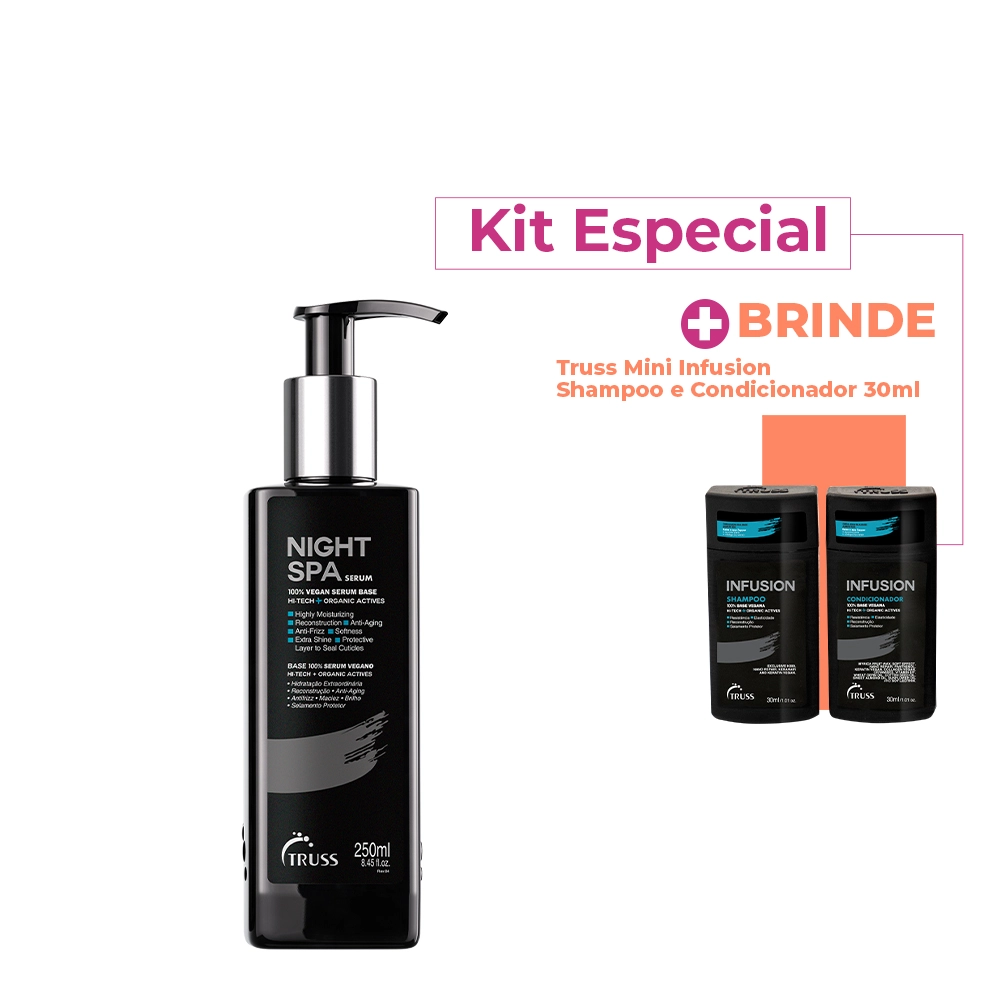 Este Kit Contém Truss Night Spa - Sérum de Tratamento Noturno 250ml: sérum hidrata intensamente e protege das agressões externas, além de disciplinar e revitalizar os fios. Brinde Truss Mini Infusion Shampoo e Condicionador 30ml Conselho de AplicaçãoKit Truss Night Spa Sérum de Tratamento Noturno e Mini Infusion (3 produtos)