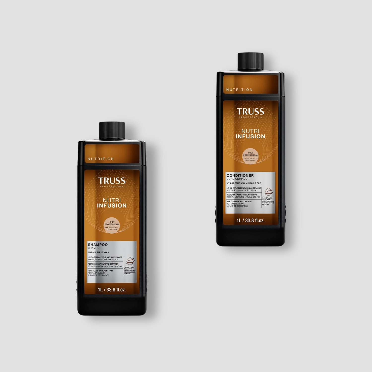 Este Kit Contém Truss Nutri Infusion - Shampoo 1L: limpeza nutritiva. Remove resíduos sem agredir, devolve a elasticidade, restaura o brilho e prepara os fios para tratamentos intensivos. Truss Nutri Infusion - Condicionador 1L: proporciona desembaraço instantâneo e selagem inteligente das cutículas. Controla o frizz, prolonga a hidratação e garante cabelos mais soltos, leves e com toque aveludado desde o primeiro uso Truss Nutri Infusion - Máscara Capilar 180g: ideal para uma recuperação intensiva. Sua fórmula rica, revitaliza fios ressecados e danificados, reduzindo a porosidade e devolvendo a maciez, com nutrição profunda e duradoura. Truss Nutri Infusion - Óleo Capilar 30ml: restaura as pontas e reduz o frizz sem pesar. Forma uma barreira protetora nos fios, contra altas temperaturas e agressões externas. Conselho de AplicaçãoTruss Nutri Infusion - 4 Passos para Fios Fortes, Sedosos e Sem Frizz