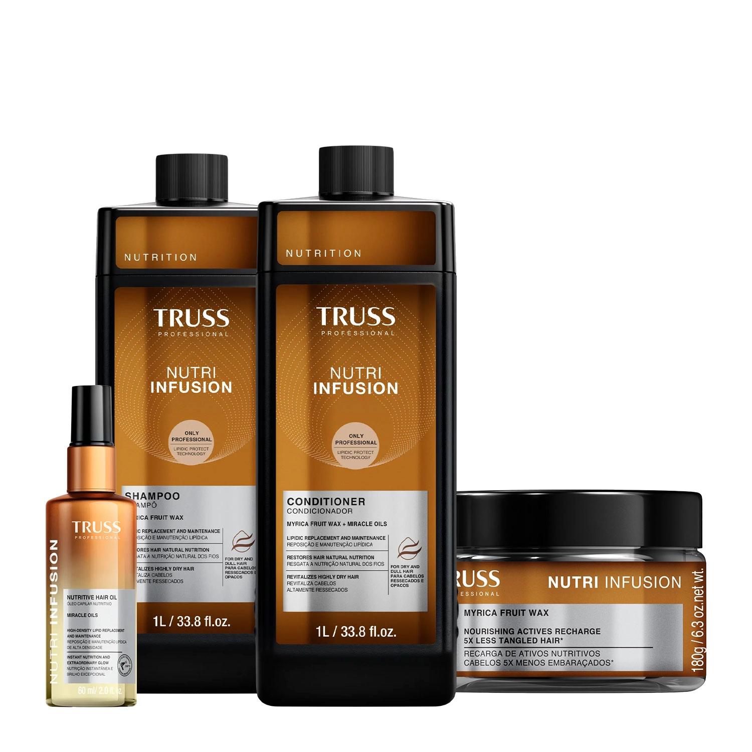 Este Kit Contém Truss Nutri Infusion - Shampoo 1L: limpa e prepara os fios para receber tratamento. Com infusão de 7 óleos preciosos, remove impurezas sem ressecar, restaura a elasticidade e intensifica o brilho natural desde a primeira lavagem. Truss Nutri Infusion - Condicionador 1L: proporciona desembaraço instantâneo e selagem inteligente das cutículas. Controla o frizz, prolonga a hidratação e garante cabelos mais soltos, leves e com toque aveludado desde o primeiro uso Truss Nutri Infusion - Máscara Capilar 180g: nutre profundamente, devolve a maciez e reduz a porosidade, promovendo cabelos mais resistentes e visivelmente renovados. Truss Nutri Infusion - Óleo Capilar 60ml: finalizador multifuncional que repara pontas, controla o frizz e protege contra o calor de até 230°C. Textura leve que não pesa e deixa os fios com brilho intenso e toque de seda.Truss Nutri Infusion - Hidratação e Força com Resultado Profissional