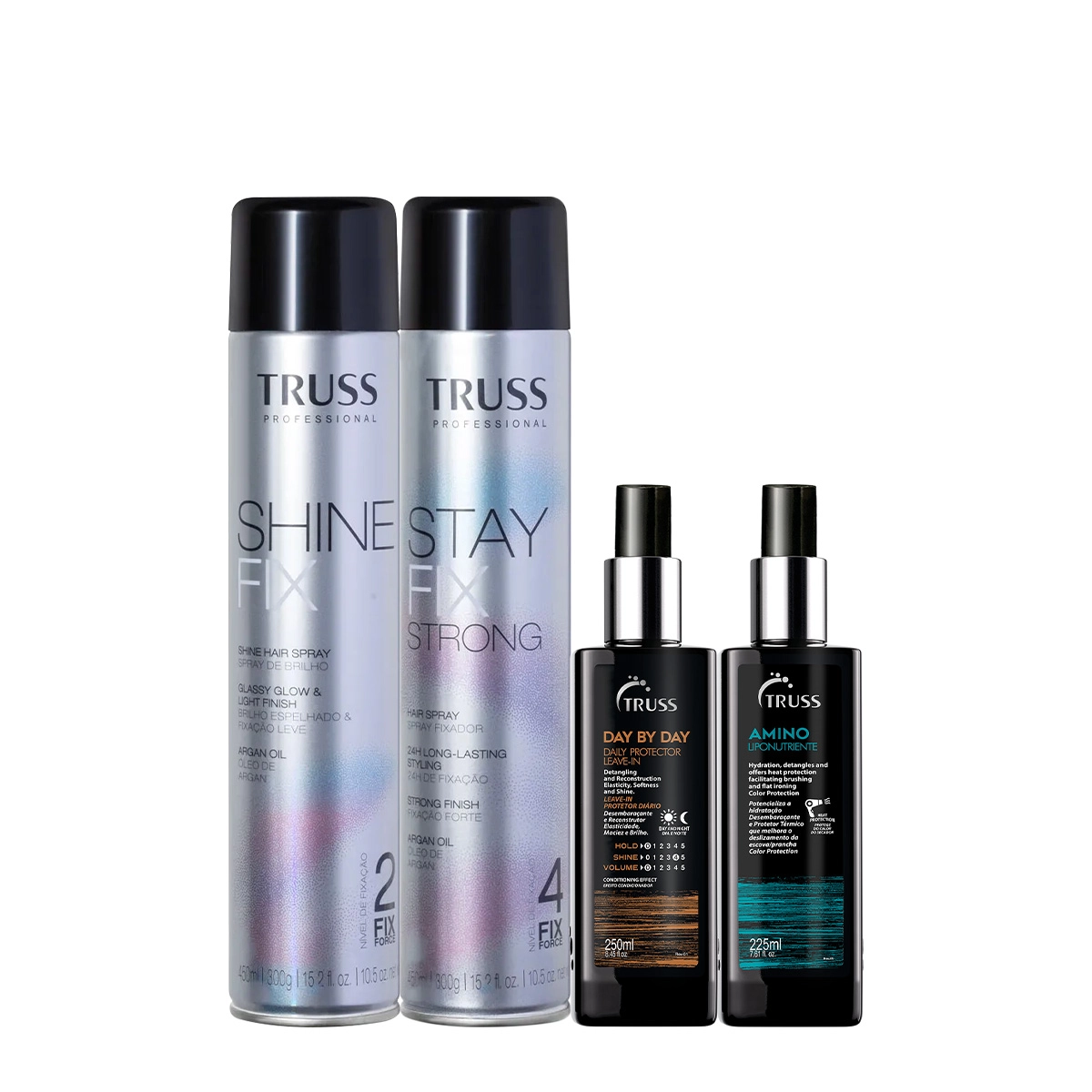 Esse Kit Contém Truss Day By Day- Fluid Spray 250ml: para cabelos danificados e ressecados protege os fios, facilita a escovação e reestrutura a fibra capilar.Truss Day By Day desembaraça, nutre e ajuda na reconstrução das áreas fragilizadas. Ele recupera a elasticidade, o brilho e a maciez no seu cuidado diário com o fio, seja de dia ou à noite. É ideal para cabelos que não tem tendência a oleosidade. Truss Amino Lipotropic Nutrients 225ml: potencializa sua hidratação! Protetor térmico hidratante em spray com efeito desembaraçante para uso junto a escova/prancha. Desembaraçante e Protetor Térmico que melhora o deslizamento da escova/prancha. Proteção e Tratamento: Promove selamento dos fios e reduz o tempo de secagem. Proporciona brilho intenso de gloss. Color Protection. Truss Shine Fix - Spray de Brilho 450ml: spray de jato seco que fixa e doa brilho ao penteado sem pesar, ressecar ou enrijecer. Com efeito barreira sem fios arrepiados para uma finalização com aspecto de recém feita. Possui fórmula enriquecida com óleo de argan e fixação de nível leve para um penteado mais radiante! Truss Stay Fix Strong - Spray Fixador Forte 450ml: fixação forte para o penteado sem pesar, ressecar ou enrijecer. Com efeito barreira sem fios arrepiados para uma finalização com aspecto de récem feita. Possui fórmula enriquecida com óleo de Argan. Conselho de aplicaçãoKit Truss Shine Fix Strong Amino Lipotropic e Day By Day (4 produtos)