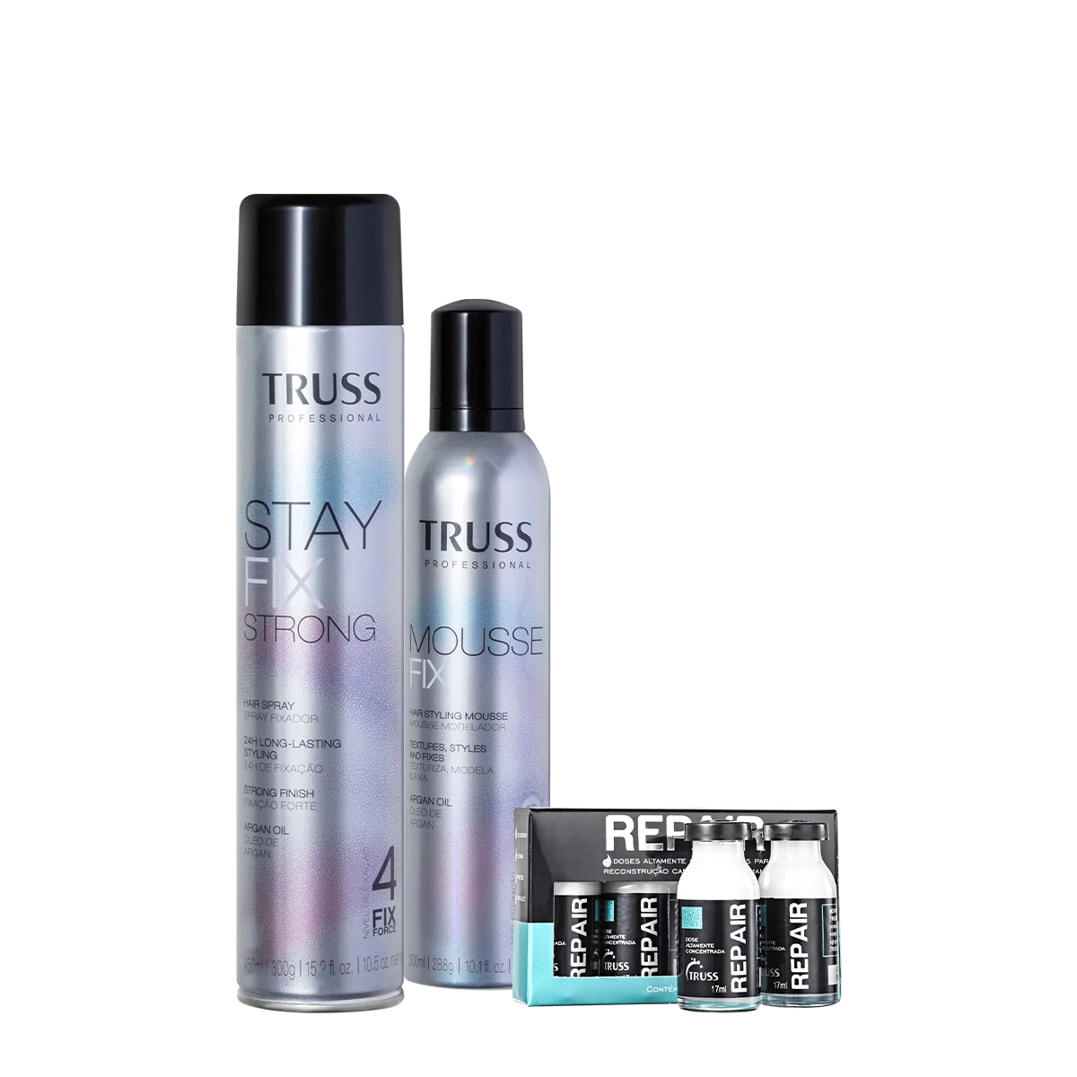 Esse Kit Contém Truss Shock Repair - Ampolas de Reconstrução 17ml (4 unidades): ampola de reconstrução para cabelos danificados. Regenera a fibra capilar para restaurar a resistência e a proteção contra os danos externos. contém ativos concentrados que agem de dentro para fora do fio. Ela devolve a força, brilho, maciez e deixa mais fácil de pentear. Também previne a formação de pontas duplas e do frizz. É ideal para fazer a manutenção dos procedimentos realizados em salão. Truss Mousse Fix - Mousse Modelador 300ml: fixa o penteado ao longo do dia. Texturiza os fios com leveza, permitindo a criação dos mais diversos looks. Fórmula enriquecida com óleo de argan auxilia a estilizar o penteado com efeito natural, sem pesar. Possui proteção térmica. Truss Stay Fix Strong - Spray Fixador Forte 450ml: fixação forte para o penteado sem pesar, ressecar ou enrijecer. Com efeito barreira sem fios arrepiados para uma finalização com aspecto de récem feita. Possui fórmula enriquecida com óleo de Argan. Conselho de AplicaçãoKit Truss Shock Repair Ampolas Mousse Fix Modelador e Strong (3 produtos)