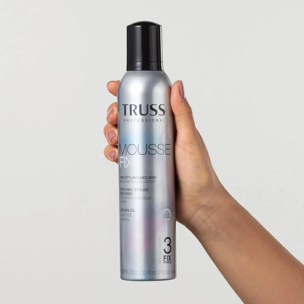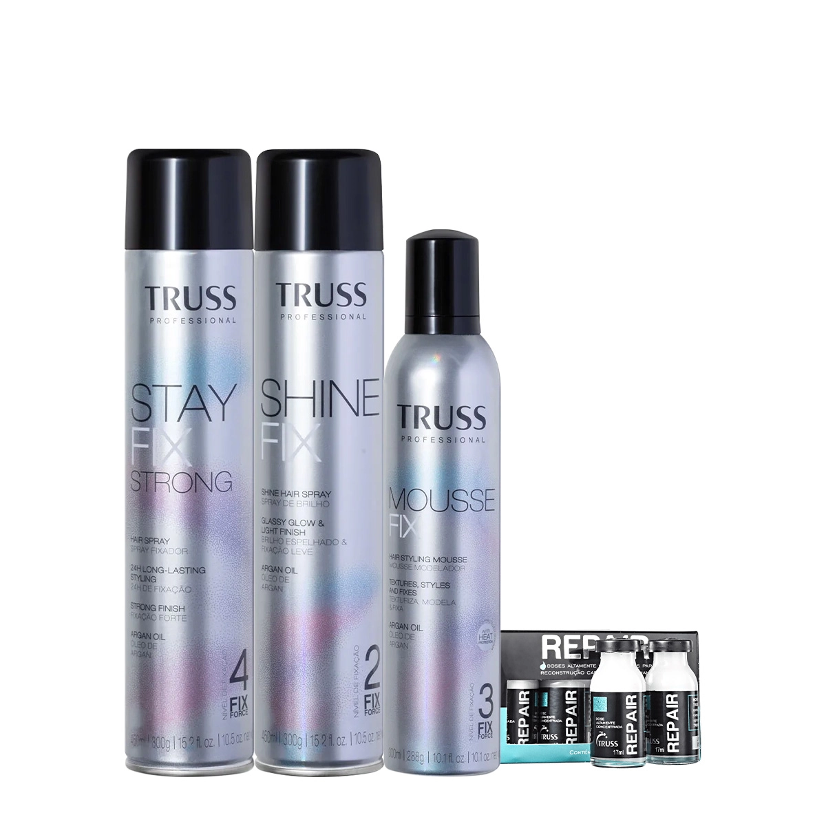 Esse Kit Contém Truss Shock Repair - Ampolas de Reconstrução 17ml (4 unidades): ampola de reconstrução para cabelos danificados. Regenera a fibra capilar para restaurar a resistência e a proteção contra os danos externos. contém ativos concentrados que agem de dentro para fora do fio. Ela devolve a força, brilho, maciez e deixa mais fácil de pentear. Também previne a formação de pontas duplas e do frizz. É ideal para fazer a manutenção dos procedimentos realizados em salão. Truss Mousse Fix - Mousse Modelador 300ml: fixa o penteado ao longo do dia. Texturiza os fios com leveza, permitindo a criação dos mais diversos looks. Fórmula enriquecida com óleo de argan auxilia a estilizar o penteado com efeito natural, sem pesar. Possui proteção térmica. Truss Shine Fix - Spray de Brilho 450ml: spray de jato seco que fixa e doa brilho ao penteado sem pesar, ressecar ou enrijecer. Com efeito barreira sem fios arrepiados para uma finalização com aspecto de recém feita. Possui fórmula enriquecida com óleo de argan e fixação de nível leve para um penteado mais radiante! Truss Stay Fix Strong - Spray Fixador Forte 450ml: fixação forte para o penteado sem pesar, ressecar ou enrijecer. Com efeito barreira sem fios arrepiados para uma finalização com aspecto de récem feita. Possui fórmula enriquecida com óleo de Argan. Conselho de Aplicação Kit Truss Shock Repair Ampolas Mousse Fix Modelador Shine e Strong (4 produtos)