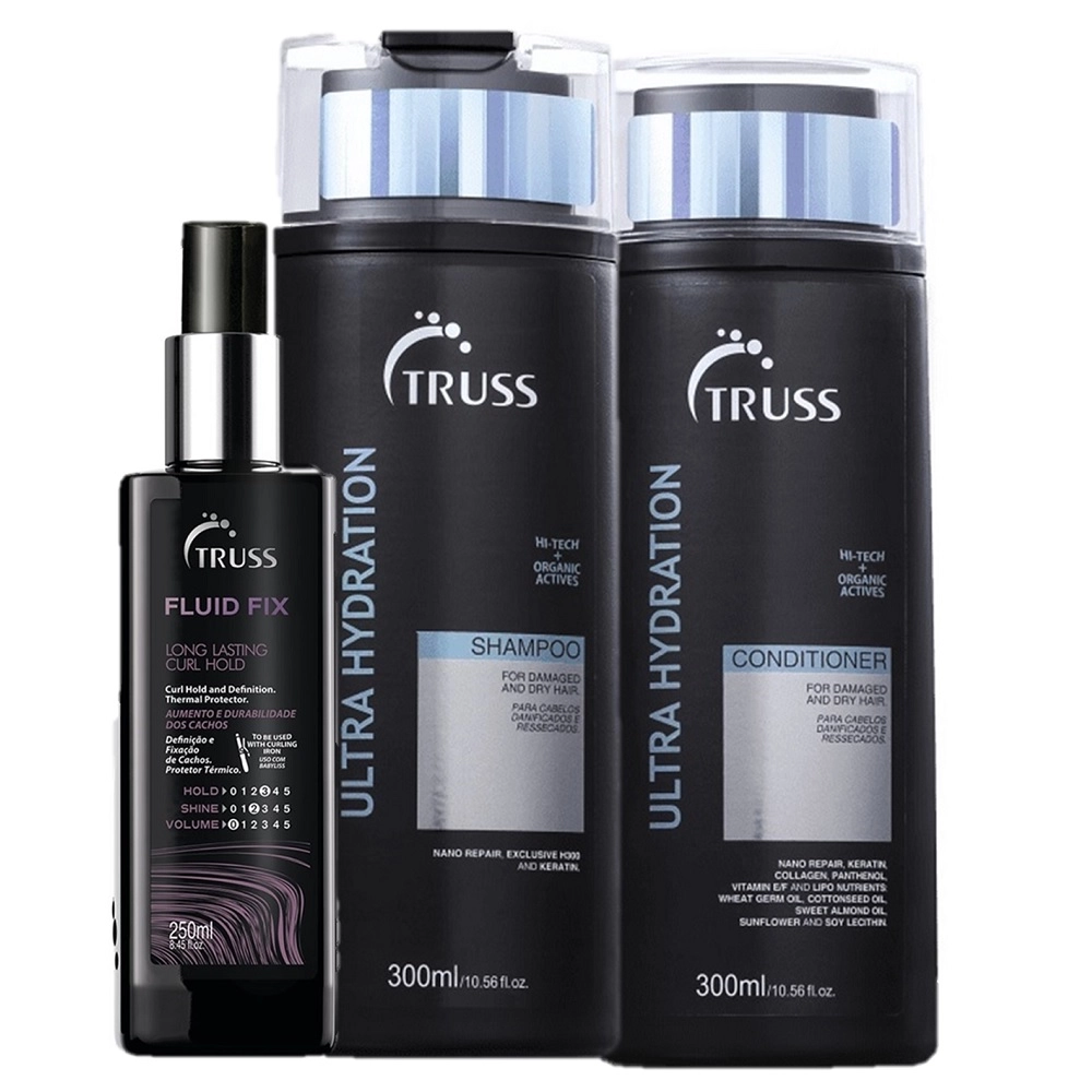 Kit diário de hidratação para cabelos secos e danificados. Kit Truss Ultra Hydration Night recupera a maciez, movimento e brilho dos fios ressecados por químicas, coloração ou danos do dia a dia. Truss Ultra Hydration - Condicionador 300ml: desembaraça e hidrata os fios de forma imediata. Truss Fluid Fix - Ativador de Cachos 250ml: Ativador de cachos para cabelos cacheados ou ondulados. Truss Fluid Fix define e fixa os cachos enquanto reduz o frizz. Sua fórmula prolonga a durabilidade do penteado por até 24 horas e promove flexibilidade. Como Usar Conselho de Aplicação Aplique o shampoo no cabelo molhado e massageie de forma suave até formar espuma. Enxágue e, caso necessário, lave os fios mais uma vez. Retire o excesso de água dos fios e distribua o condicionador no comprimento e pontas. Massageie, desembarace, deixe agir por 2 minutos e enxágue. Sobre os cabelos secos borrife de 2 a 3 jatos por mecha do spray ativador de cachos. Espalhe e rapidamente enrole com o babyliss. Aguarde alguns segundos e desenrole.Kit Truss Ultra Hydration Fluid Cabelos Ressecados (3 Produtos)