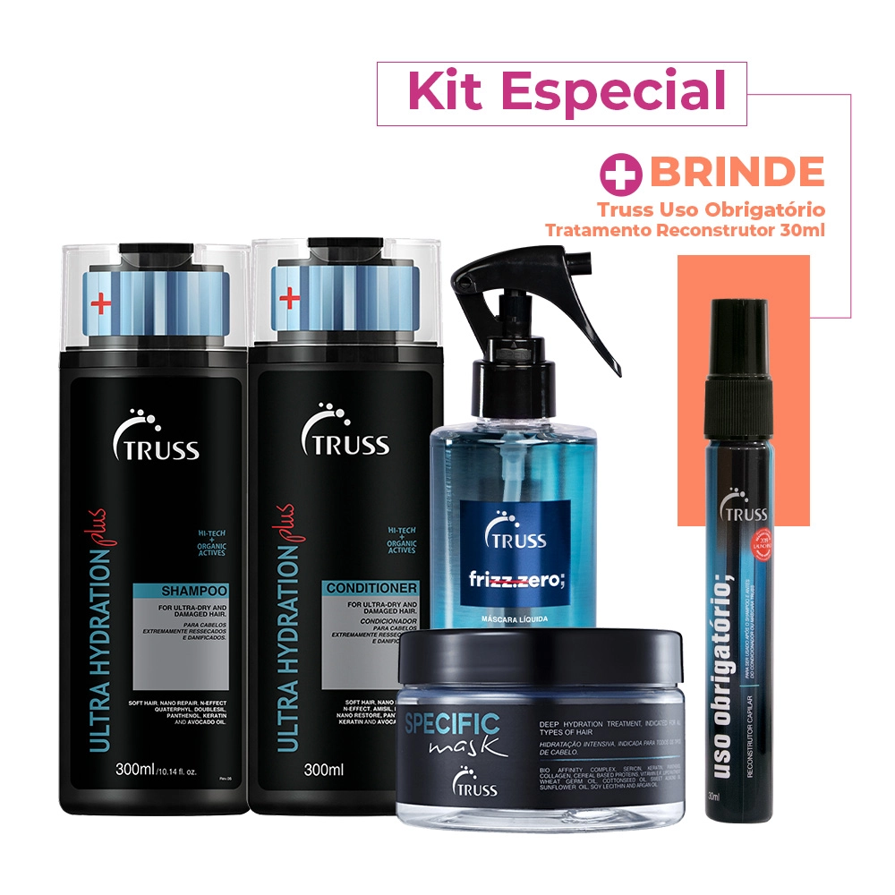 Kit Truss Ultra Hydration Plus Specific Frizz (5 produtos) Este Kit Contém Truss Ultra Hydration Plus - Shampoo 300ml: limpa, restaura a hidratação e aumenta a resistência, brilho e maciez dos fios. Truss Ultra Hydration Plus - Condicionador 300ml: desembaraça, recupera intensamente a força, o brilho e o toque sedoso. Truss Specific – Mascara Capilar 180g: para todos os tipos de cabelo, repara os fios de forma intensa enquanto repõe a hidratação. Truss Frizz Zero - Condicionador 260ml: para todos os tipos de cabelos, pode ser usado como pré-shampoo ou máscara líquida nas lavagens. Ganhe Truss Mini Uso Obrigatório Tratamento Reconstrutor 30ml: Reconstrutor para cabelos danificados. Truss Uso Obrigatório recupera o aspecto saudável enquanto disciplina e protege do calor Conselho de Aplicação