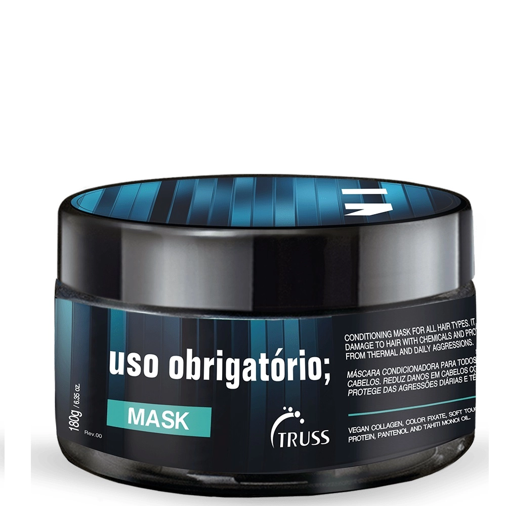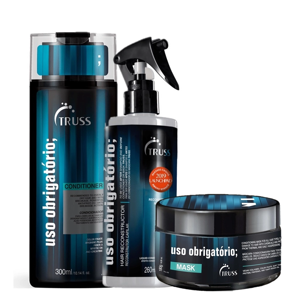 Truss Uso Obrigatório é um verdadeiro sucesso mundial! Seus tratamentos trazem diversos benefícios para os fios, inclusive reparação de danos, redução do frizz, desembaraço, combate às pontas duplas e proteção ao desbotamento da cor. Experimente o Truss Uso Obrigatório ideal para você! Este Kit Contém Truss Uso Obrigatório - Condicionador 300ml: Hidrata, reduzindo os danos em cabelo com química e sela as cutículas. Promovendo suavidade e brilho aos fios e possui ação antidesbotamento. Truss Uso Obrigatório - Máscara 180g: reduz danos em cabelos com química e protege das agressões diárias e térmicas. Truss Uso Obrigatório - Leave-in e Tratamento Reconstrutor 260ml: condiciona e reconstrói cabelos cabelos desvitalizados, quebradiços e que fazem o uso constante de secador e prancha. Como Usar Conselho de Aplicação Condicionador: Com os fios limpos, distribua o condicionador do comprimento às pontas dos fios e massageie. Deixe em pausa por 2 minutos e enxágue bem. Máscara: Aplique a máscara condicionadora após o Shampoo, deixe agir por 5 minutos e enxágue . Utilize 1 á 3 vezes por semana. Leave-in: aplique sobre o cabelo limpo e úmido. Finalize como desejar.Kit Truss Uso Obrigatorio Acao Desembaracante e Anti Frizz (3 Produtos)