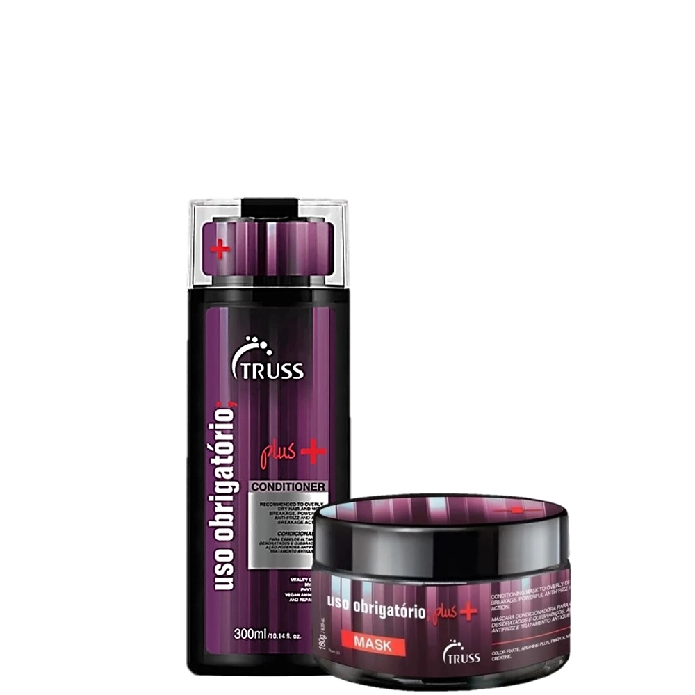 Uso Obrigatório Plus+ Truss é uma linha com tecnologia inovadora e poderosa com efeito antiquebra, recupera, reestrutura e repara totalmente as áreas da fibra capilar que estão fragilizadas, danificadas e quebradiças, atuando na reconstrução dos fios desde o seu interior. Este Kit Contém Truss Uso Obrigatório Plus - Condicionador 300ml: recupera, reestrutura e repara totalmente as áreas da fibra capilar fragilizadas. Truss Uso Obrigatório Plus - Máscara Capilar 180g: hidrata e recupera os fios danificados, auxiliando na penteabilidade e no aumento do brilho. Como Usar Conselho de Aplicação Condicionador: Aplique o condicionador nos fios molhados e massageie. Deixe agir por 2 minutos e enxágue. Repita a operação se necessário. Máscara: Aplique a máscara condicionadora após o shampoo, deixe agir po 5 minutos e enxágue.Kit Truss Uso Obrigatorio Plus Acao Desembaracante (2 Produtos)