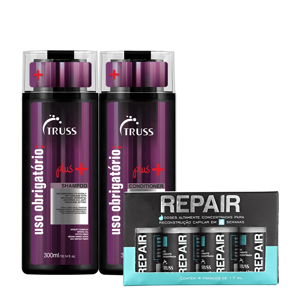 Kit Truss Uso Obrigatório Plus Shampoo Condicionador Shock Repair (6 produtos) Este Kit Contém Truss Uso Obrigatório Plus - Shampoo 300ml: recupera, reestrutura e repara totalmente as áreas da fibra capilar fragilizadas. Truss Uso Obrigatório Plus - Condicionador 300ml: recupera, reestrutura e repara totalmente as áreas da fibra capilar fragilizadas. Truss Shock Repair - Ampolas de Reconstrução 17ml (4 unidades): para cabelos danificados. Regenera a fibra capilar para restaurar a resistência e a proteção contra os danos externos. Contém ativos concentrados que agem de dentro para fora do fio. Ela devolve a força, brilho, maciez e deixa mais fácil de pentear. Também previne a formação de pontas duplas e do frizz. Conselho de Aplicação Shampoo: aplique o shampoo no cabelo molhado e massageie de forma suave até formar espuma. Enxágue e, caso necessário, lave os fios mais uma vez.