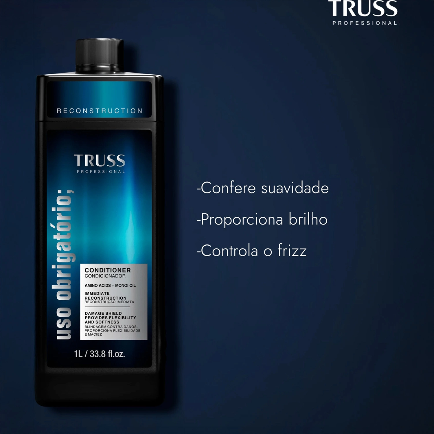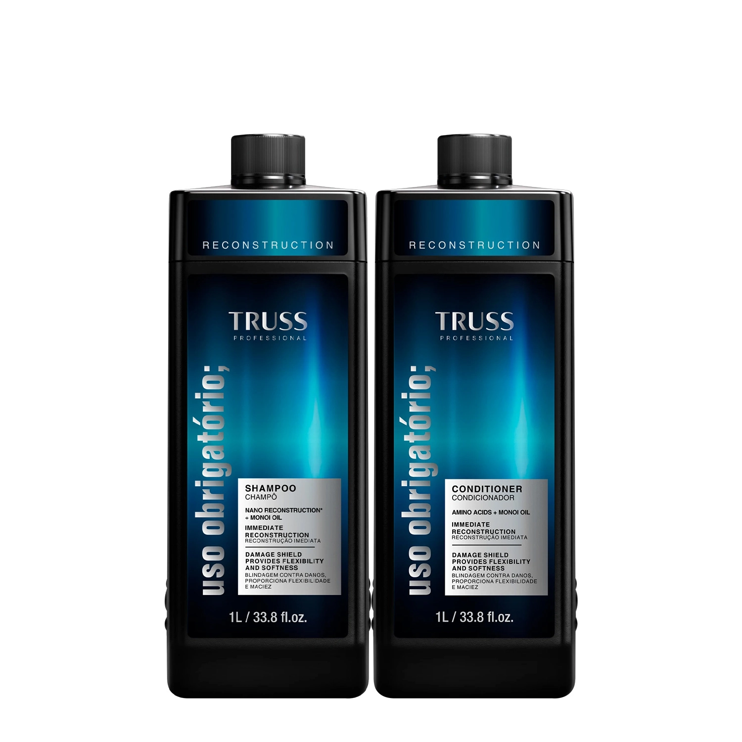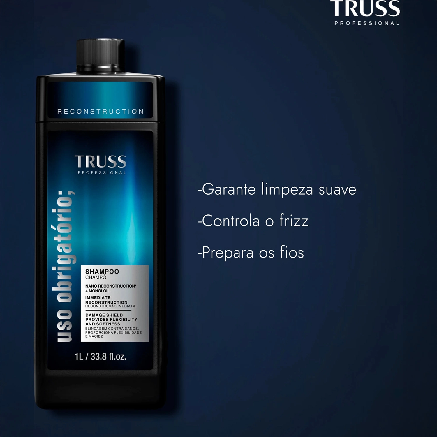 Este Kit Contém Truss Uso Obrigatório Reconstruction Refil - Shampoo 1L: limpa sem agredir, recupera a estrutura dos fios, fortalece, reduz a quebra e prolonga a cor. Proporciona brilho intenso, sedosidade e controle do frizz já na primeira aplicação. Truss Uso Obrigatório Reconstruction Refil - Condicionador 1L: tratamento poderoso com aminoácidos e monoi oil, que reparam profundamente, selam as cutículas, reduzem o frizz e oferecem proteção duradoura. Recupera a elasticidade, promove maciez extrema e combate a quebra, deixando os fios mais resistentes, hidratados e luminosos. Conselho de AplicaçãoTruss Uso Obrigatório Reconstruction - Reconstrução Capilar, Força e Brilho Imediato