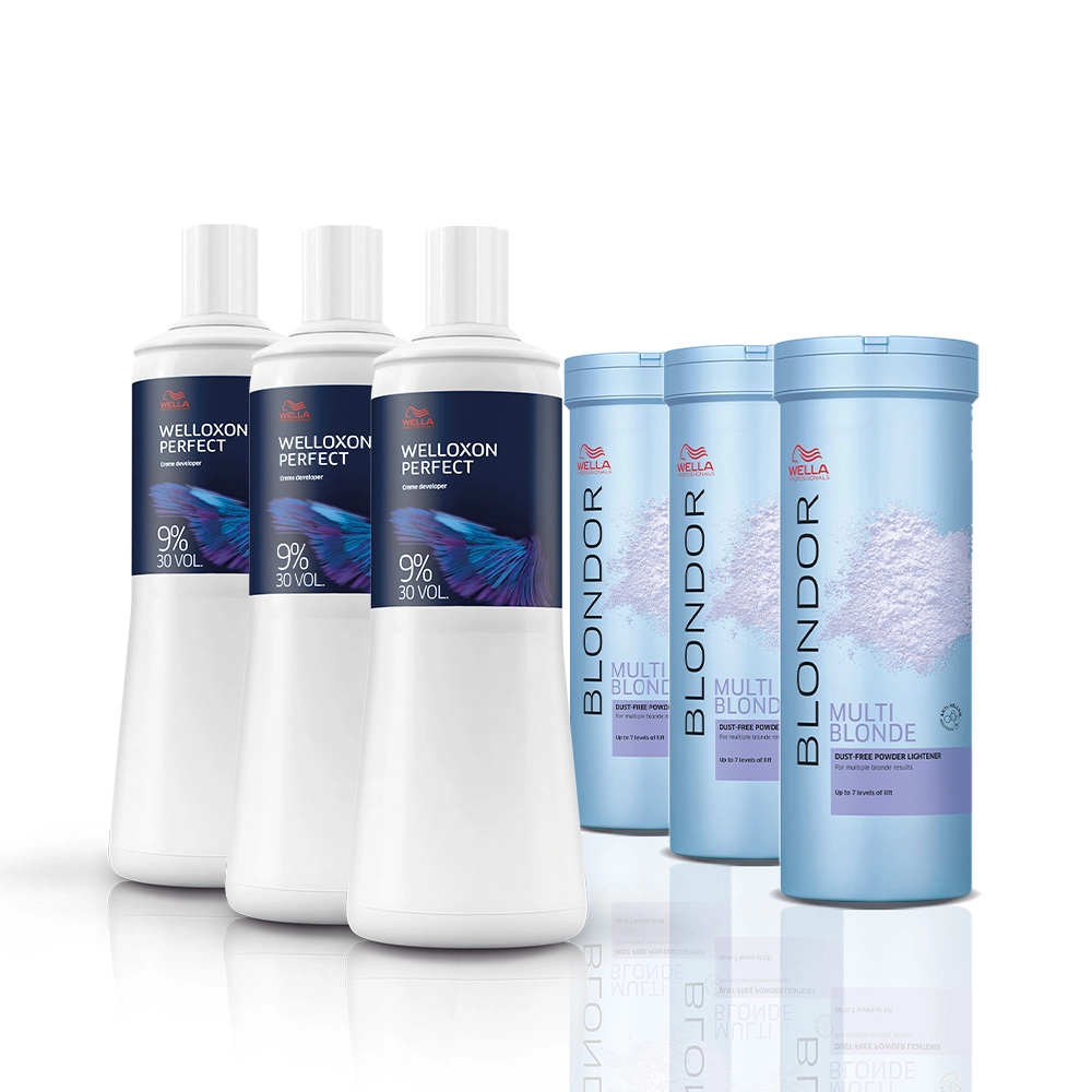 Wella Professionals Blondor Multi Blonde - Pó Descolorante 400g (3 unidades): pó descolorante profissional da Wella Professionals que clareia até 7 tons de maneira uniforme e confiável, para loiros lindos e perfeitos. Remove o pigmento dos fios de maneira controlada e com delicadeza, sem agredir o couro cabeludo ou quebrar os fios. Além de tudo, o descolorante Wella é rápido e proporciona um amplo leque de possibilidades, desde o loiro mais quente até o extra frio. Wella Professionals Welloxon Perfect 9% - Oxidante 30 Volumes 1L (3 unidades): oxidante profissional de 30 volumes. Wella Welloxon Perfect 9% garante resultados vibrantes, bonitos e fiéis à cartela de cor. Consegue clarear até 3 tons e é ideal para criar todo tipo de fios claros. Sugestão de Aplicação Siga atentamente às instruções do oxidante e na bula da coloração escolhida. Atente-se às quantidades de mistura e ao tempo de pausa indicados. Este Kit Contém