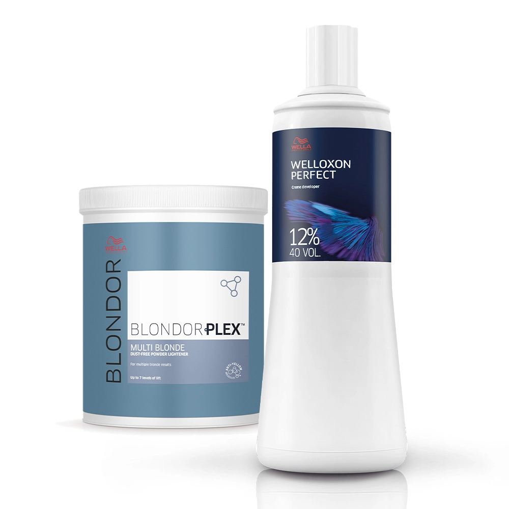 Este Kit Contém Wella Professionals BlondorPlex N°1 - Pó Descolorante 800g: pó descolorante profissional. Proporciona até 7 níveis de clareamento uniforme e protege contra a desidratação. Clareia sem danificar os fios, garantindo até 97% menos quebra*. Sua fórmula conta ainda com moléculas antiamarelamento e tecnologia Dust Free que facilita a aplicação. *Quando usado com BlondorPlex N°2 vs. BlondorPlex sozinho. Wella Professionals Welloxon Perfect 12% - Oxidante 40 Volumes 1L: garante resultados vibrantes, bonitos e fiéis à cartela de cor. Consegue clarear até 4 tons e é ideal para criar todo tipo de fios claros. Potencializa a coloração ao mesmo tempo em que desbota os pigmentos naturais e proporciona um efeito uniforme, controlado e confiável. Conselho de Aplicação Siga as instruções de mistura e tempo de pausa descritas na embalagem. Cumpra todos os passos, sem pular etapas. Kit Wella Professionals BlondorPlex N°1 Multi Blonde + Oxidante 12% 40V (2 produtos)