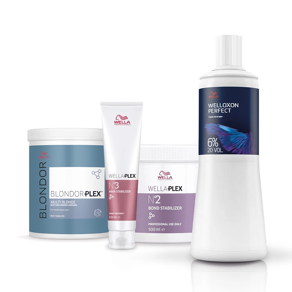 Este Kit Contém Wella Professionals BlondorPlex N°1 - Pó Descolorante 800g: pó descolorante profissional. Proporciona até 7 níveis de clareamento uniforme e protege contra a desidratação. Clareia sem danificar os fios, garantindo até 97% menos quebra*. Sua fórmula conta ainda com moléculas antiamarelamento e tecnologia Dust Free que facilita a aplicação. *Quando usado com BlondorPlex N°2 vs. BlondorPlex sozinho. Wella Professionals BlondorPlex N°2 Bond Stabilizer - Máscara Capilar 500ml: máscara plex com tratamento condicionante. Fortalece a estrutura capilar após tratamentos químicos, além de equilibrar o pH. Ela traz a exclusiva tecnologia com o sistema Opti pH que ajuda a reconstruir o cabelo internamente para deixar os fios mais fortes durante e após a descoloração e serviços de coloração, garantindo resultados perfeitos de cor. O produto deve ser utilizado após a aplicação de BlondorPlex N°1 durante o mesmo serviço. Wella Professionals WellaPlex Nº3 Hair Stabilizer - Máscara Reconstrutora 100ml: máscara reconstrutora para cabelos danificados e quimicamente tratados. Wella Professionals WellaPlex Nº3 Hair Stabilizer reconstrói os fios e ajuda a manter o cabelo saudável e forte. Para cabelos que passaram por químicas, descolorações, colorações, mechas, balaiagens, uso obrigatório para loiras. Wella Professionals Welloxon Perfect 6% - Oxidante 20 Volumes 1L: revela a cor de maneira uniforme, com intensidade e totalmente fiel à cartela de cores. Clareia até 2 tons e é ideal para fazer cobertura de fios brancos. Desenvolvido para utilizar com as colorações permanentes, proporciona mistura fácil de aplicar e de remover. Conselho de Aplicação Plex 1: siga as instruções de mistura e tempo de pausa descritas na embalagem. Cumpra todos os passos, sem pular etapas. Plex 2: o produto deve ser utilizado após a aplicação de BlondorPlex N°1 durante o mesmo serviço. Aplique BlondorPlex N°2 no cabelo úmido e deixe por 10 minutos. Enxágue bem. Aplique shampoo, condicionador e finalize como de costume. Pelx 3: use no mínimo 1 vez por semana após lavar com seu shampoo e tirar o excesso de água com uma toalha, deixe por 5 a 10 minutos e depois enxágue. Oxidante: siga atentamente às instruções do oxidante e na bula da coloração escolhida. Atente-se às quantidades de mistura e ao tempo de pausa indicados.Kit Wella Professionals BlondorPlex Nº1 + Nº2 Bond Stabilizer + Nº3 Máscara Reconstrutora + Oxidante 6% 20V (4 produtos)