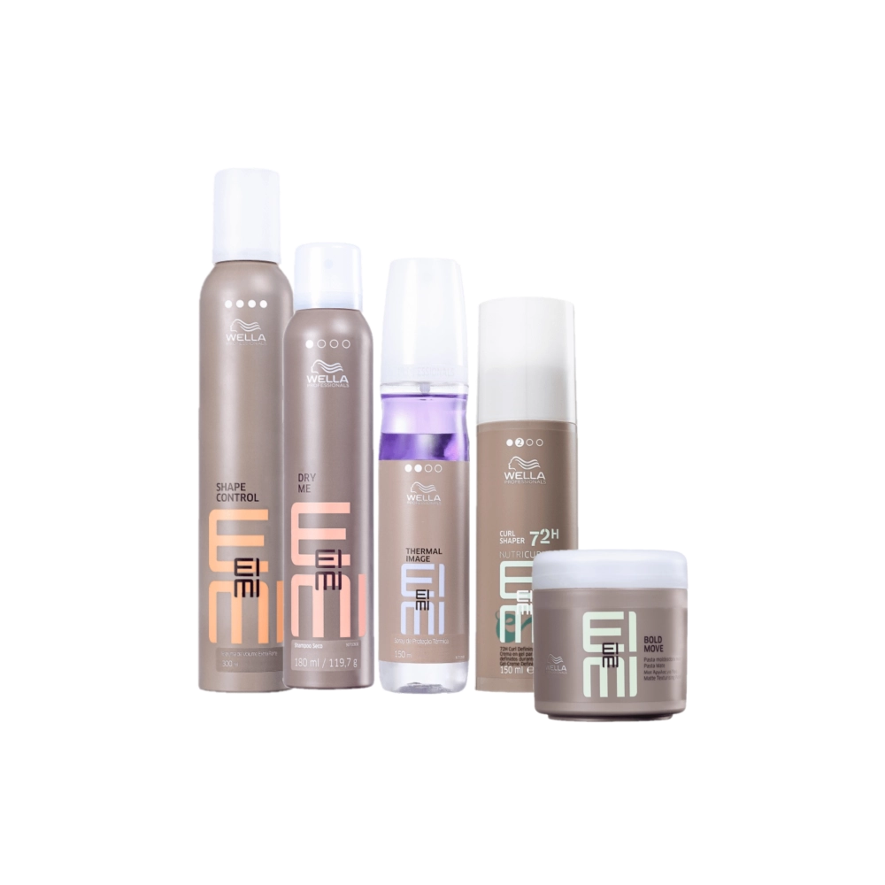 Este Kit Contém Wella Professionals EIMI Dry Me - Shampoo a Seco 180ml: shampoo a seco para todos os tipos de cabelo. Formulado com amido de tapioca, Wella Professionals EIMI Dry Me absorve a oleosidade dos fios, além de proporcionar textura fosca e maleável. Wella Professionals EIMI Nutricurls Curl Shaper - Ativador de Cachos 150ml: ativador de cachos para cabelos naturalmente ondulados ou cacheados. Proporciona 72 horas de definição e nutrição. Perfeito para quem sente dificuldade me marcar as curvas. Wella Professionals EIMI Bold Move - Pasta Modeladora 150ml: pasta modeladora com acabamento matte. Elaborada com Cera de Carnaúba brasileira, Wella Professionals EIMI Bold Move texturiza e modela com fixação moderada e finalização fosca. Wella Professionals EIMI Shape Control - Mousse de Volume 300ml: com fixação extraforte. É um finalizador perfeito para penteados que necessitam duração prolongada. Garante controle resistente e suporte firme, com finalização perfeita e brilho radiante. Wella Professionals EIMI Thermal Image - Protetor Térmico 150ml: protetor térmico, controla o frizz e garante brilho impecável. É um spray bifásico que ajuda a disciplinar os fios. A fase 1 nutre e protege o cabelo do calor de até 220°C. Já a fase 2 suaviza o cabelo para proporcionar maciez e brilho. Conselho de Aplicação Shampoo a seco: antes de usar agite o frasco. Borrife uniformemente sobre o cabelo seco. Em seguida, penteie o cabelo para espalhar o produto. Ativador de cachos: aplique uniformemente pelo cabelo úmido e finalize como desejar, deixando secar naturalmente ou com o difusor. Pasta Modeladora: espalhe uma pequena quantidade na palma das mãos. Em seguida, aplique no cabelo seco e modele a forma desejada. Mousse de volume: agite antes de usar. Aplique uniformemente no cabelo úmido em toda extensão dos fios, da raiz às pontas. Finalize com o auxílio do secador. Protetor térmico: agite bem antes de usar. Borrifar por seções nos cabelos úmidos antes do secador ou nos fios secos para proteger o cabelo antes de usar acessórios térmicos como chapinha.Kit Wella Professionals EIMI Spray Curl Pasta Control Thermal (5 produtos)