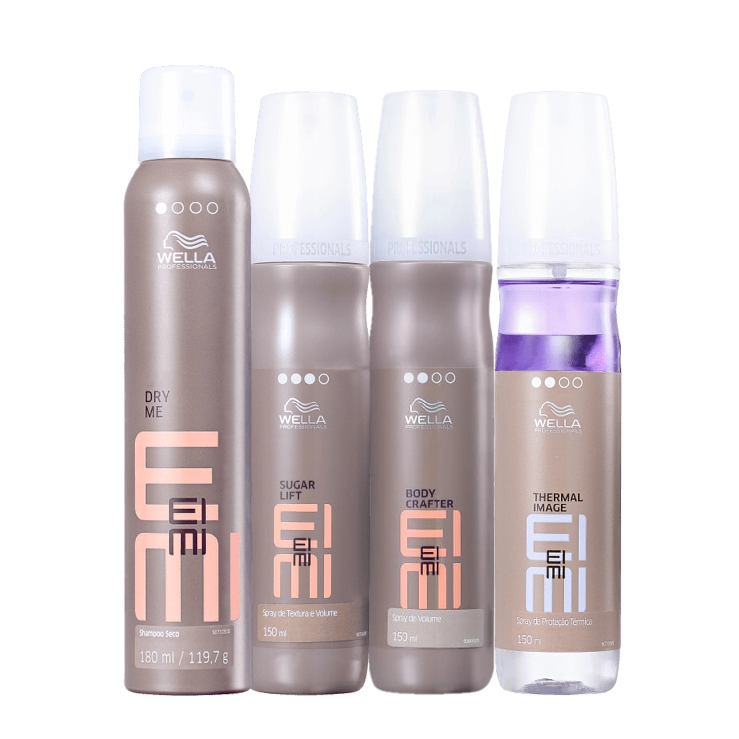 Este Kit Contém Wella Professionals EIMI Dry Me - Shampoo a Seco 180ml: shampoo a seco para todos os tipos de cabelo. Formulado com amido de tapioca, Wella Professionals EIMI Dry Me absorve a oleosidade dos fios, além de proporcionar textura fosca e maleável. Wella Professionals EIMI Sugar Lift - Spray de Textura e Volume 150ml: spray flexível para todos os tipos de cabelo formulado com infusão de açúcar, adiciona corpo, volume e brilho intenso. Possui fixação média, que pode ser usado no cabelo seco ou úmido. Wella Professionals EIMI Body Crafter - Spray de Volume 150 ml: spray de volume com fixação média, adiciona volume com textura e movimento natural. Garante finalização com controle, flexibilidade e suavidade. Wella Professionals EIMI Thermal Image - Protetor Térmico 150ml: protetor térmico, controla o frizz e garante brilho impecável. É um spray bifásico que ajuda a disciplinar os fios. A fase 1 nutre e protege o cabelo do calor de até 220°C. Já a fase 2 suaviza o cabelo para proporcionar maciez e brilho. Conselho de Aplicação Shampoo a seco: antes de usar agite o frasco. Borrife uniformemente sobre o cabelo seco. Em seguida, penteie o cabelo para espalhar o produto. Spray de Textura e Volume: agite bem e borrife sobre o cabelo úmido, principalmente na raiz. Seque com secador ou faça escova para criar volume. Spray de Volume: agite bem e borrife sobre o cabelo úmido, principalmente na raiz. Seque com secador ou faça escova para criar volume. Você pode usar no cabelo seco para destacar um volume extra aos fios. Protetor térmico: agite bem antes de usar. Borrifar por seções nos cabelos úmidos antes do secador ou nos fios secos para proteger o cabelo antes de usar acessórios térmicos como chapinha. Kit Wella Professionals EIMI Spray Textura Volume Thermal (4 produtos)