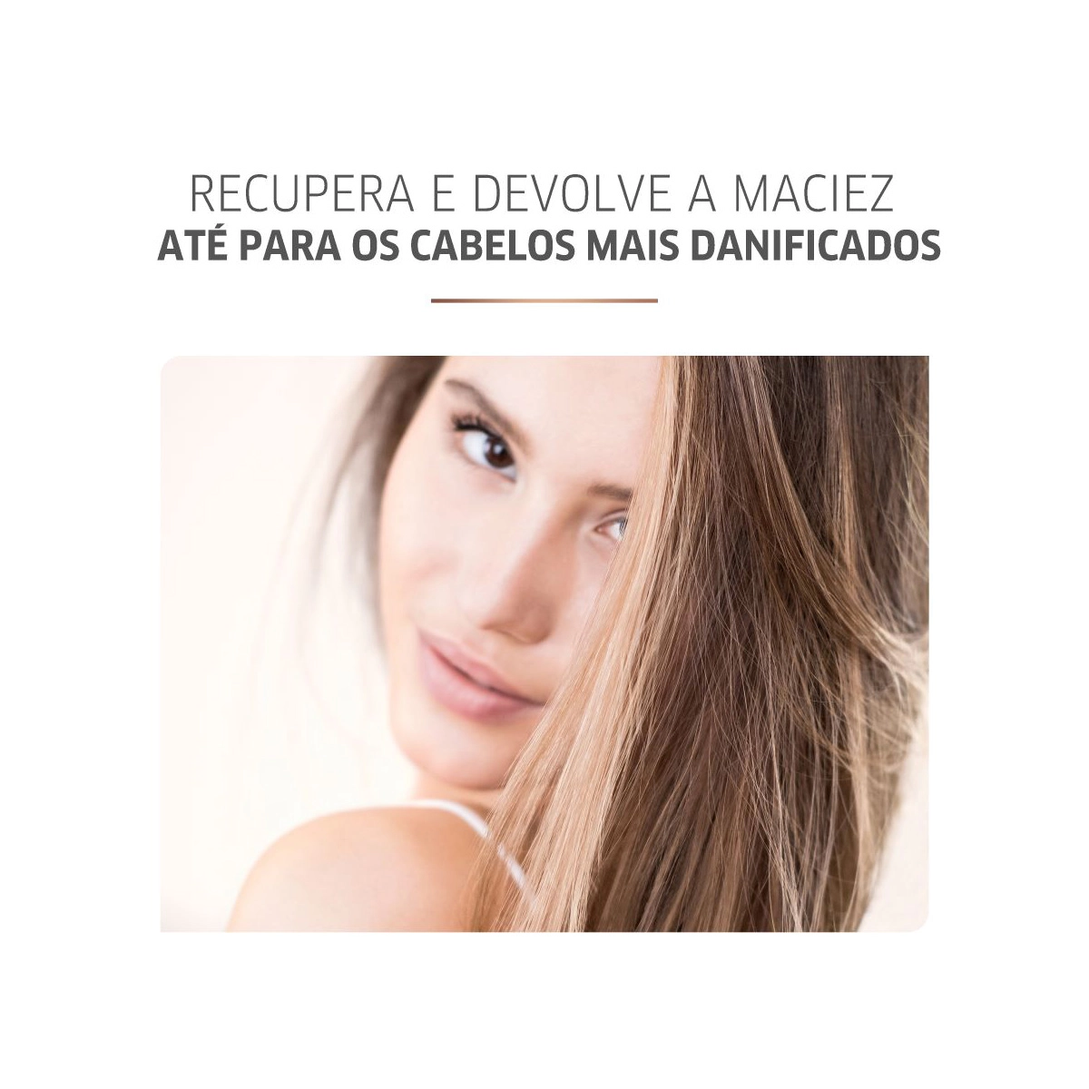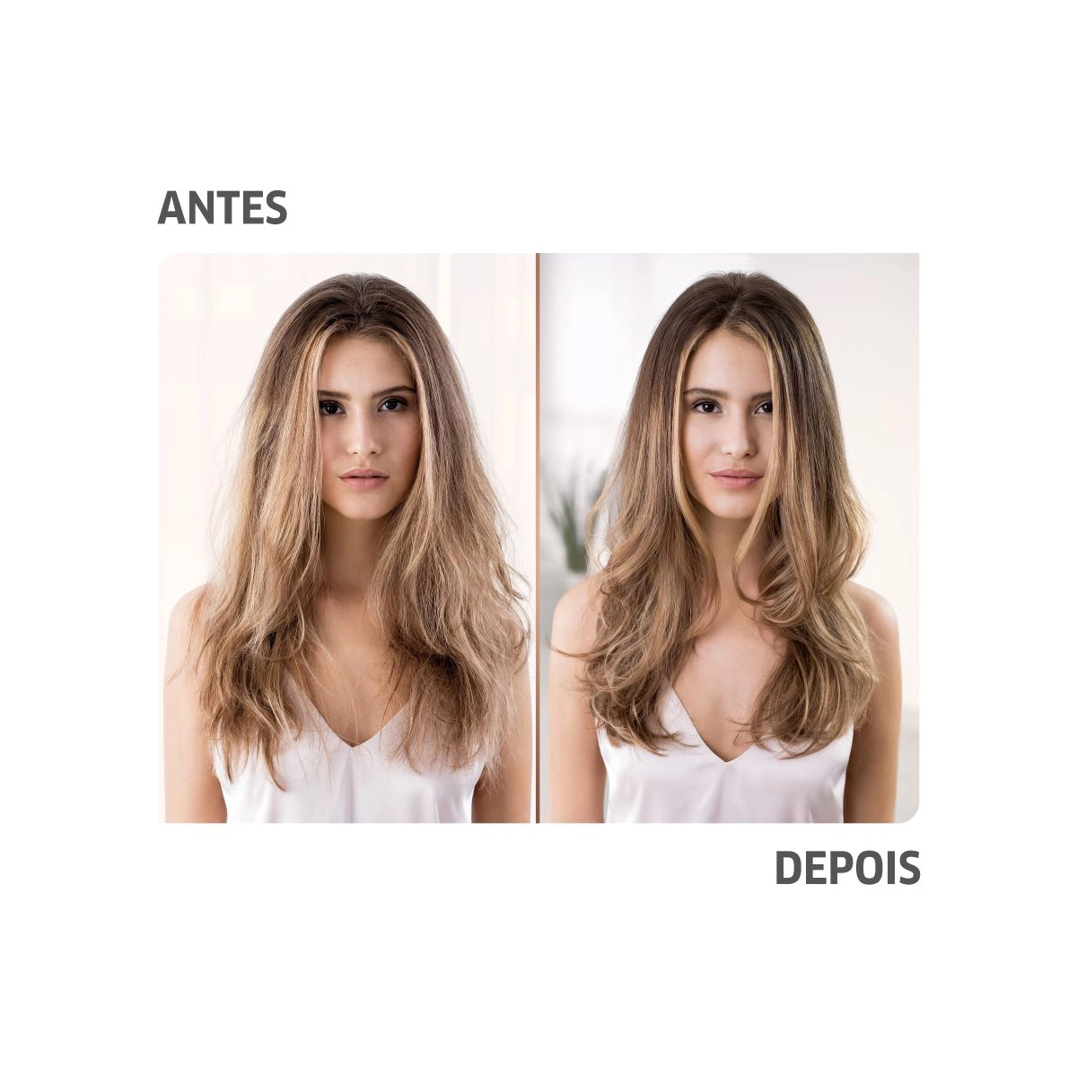 Máscara: depois de usar o shampoo, remova o excesso de água com uma toalha. Distribua a máscara sobre o comprimento e pontas e deixe agir por 5 minutos. Enxágue completamente.