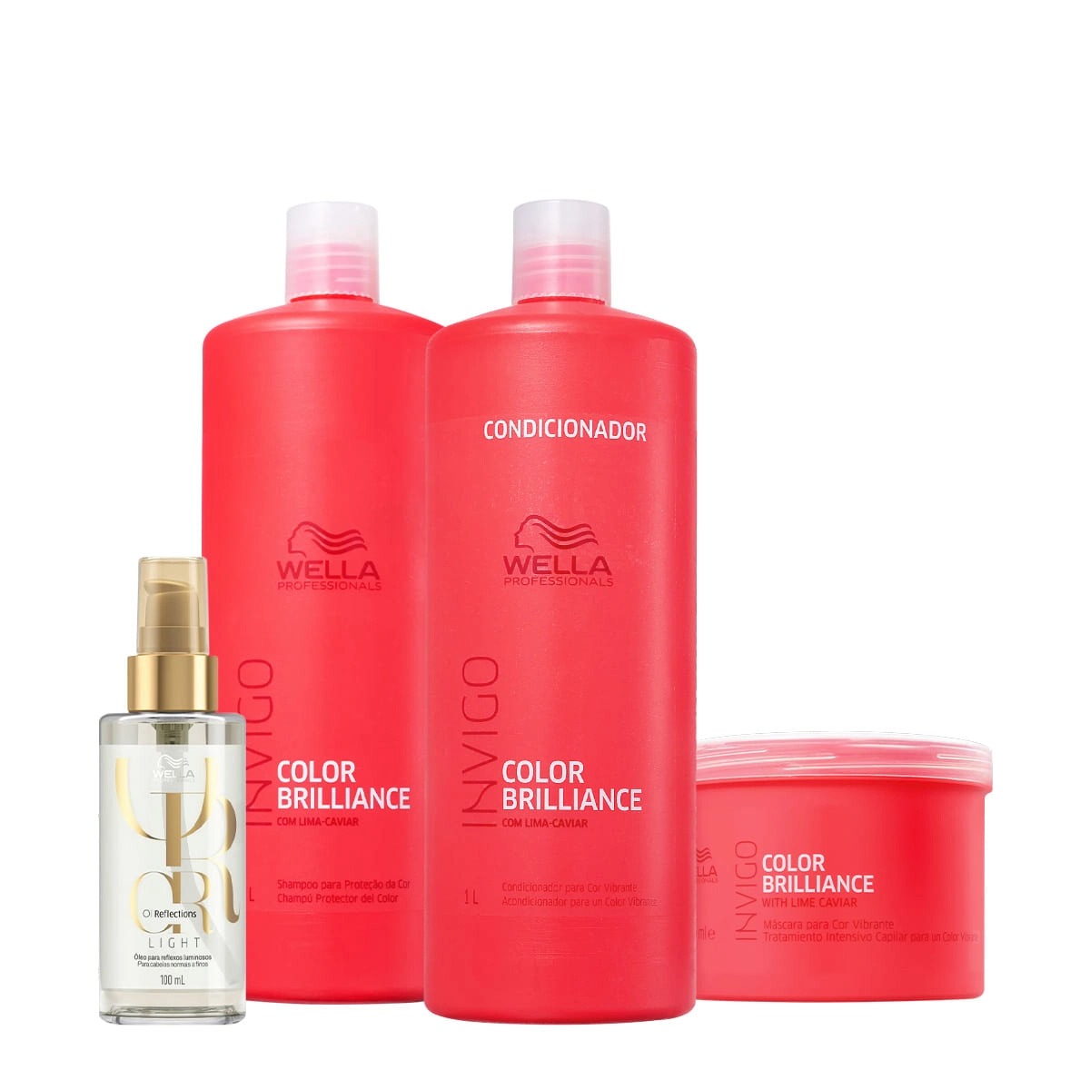 Este Kit Contém Wella Professionals Invigo Color Brilliance - Shampoo 1L: limpa os fios de forma otimizada para proteger do desbotamento. Preserva a cor vibrante por até 7 semanas. Wella Professionals Invigo Color Brilliance - Condicionador 1L: desembaraça os fios e mantém a cor linda e vibrante por mais tempo. Com proteção da cor por até 7 semanas. Wella Professionals Invigo Color Brilliance - Máscara Capilar 500ml: proporciona proteção da cor por até 7 semanas. Sua fórmula é rica em vitaminas que nutrem o cabelo, resultando em fios saudáveis, protegidos do desbotamento e com a cor linda. Wella Professionals Oil Reflections Luminous Smoothening Light - Óleo Capilar 100ml: protege, nutre e deixa o cabelo macio com efeito gloss. É mais nutritivo, sendo indicado para cabelos que precisam de uma carga maior de nutrientes e brilho. Conselho de AplicaçãoKit Wella Professionals Invigo Brilliance Reflections Salon Total Oil (4 produtos)