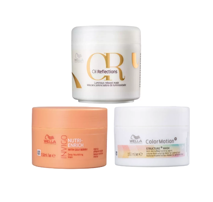 Este Kit Contém Wella Professionals Invigo Nutri-Enrich- Máscara Capilar 150ml: tratamento intensivo com nutrição capilar que hidrata e nutre profundamente para restaurar a saúde dos fios e garantir um toque sedoso e muito brilho. Wella Professionals Color Motion+ - Máscara Capilar 150ml: traz força, brilho intenso e proteção da cor, para cabelos coloridos e danificados. Reconstrói a estrutura capilar, deixando-a mais resistente e saudável. Wella Professionals Oil Reflections Luminous Reboost - Máscara 150ml: restaura a estrutura capilar e deixa os fios macios e luminosos. Hidrata profundamente, ajudando a promover menos perda de água dos fios. Conselho de AplicaçãoKit Wella Professionals Invigo Enrich Reflections Color Cronograma Capilar 150 (3 produtos)