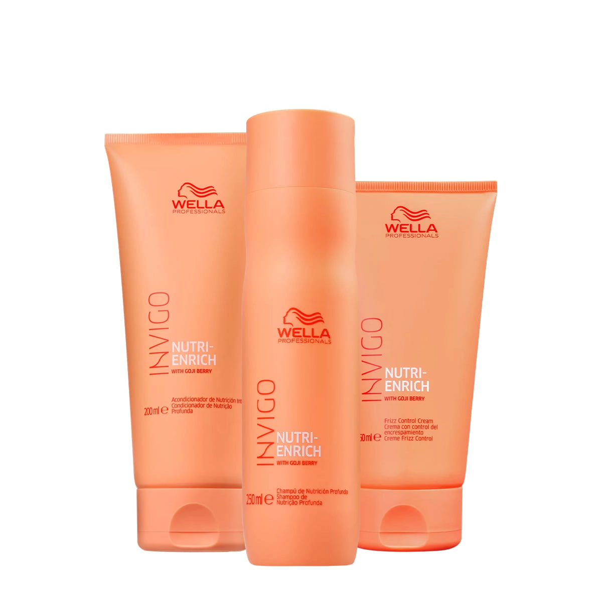 Este Kit Contém Wella Professionals Invigo Nutri-Enrich - Shampoo 250ml: tem o poder de hidratar e nutrir os fios desde o momento da lavagem e, assim, vai muito além de limpar. Wella Professionals Invigo Nutri-Enrich - Condicionador 200ml: desembaraça os fios enquanto hidrata e nutre. Ele é rico em ativos que melhoram a qualidade do cabelo e suaviza sua superfície para que fique com um toque macio. Wella Professionals Invigo Nutri-Enrich Frizz Control - Leave-in Antifrizz 150ml: nutre intensamente, combate o frizz e proporciona maleabilidade aos fios. Com blend de nutrientes multifuncionais, restaura a maciez, brilho e vitalidade do cabelo. Conselho de AplicaçãoKit Wella Professionals Invigo Nutri-Enrich Antifrizz Duo Leave-in (3 produtos)